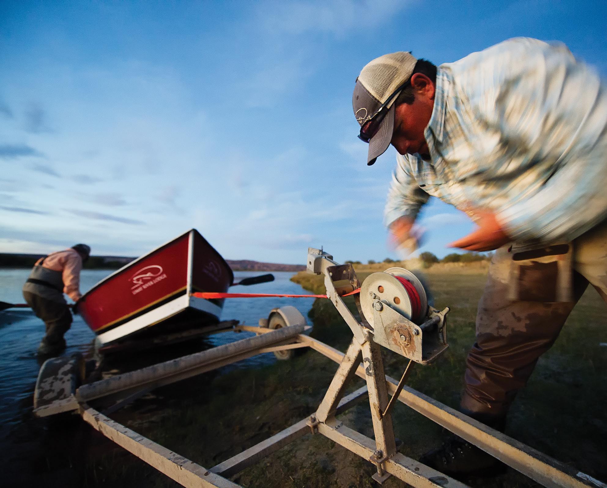 - Guide Nano Martinez winches in the drift boat on his home waters on he Limay River.