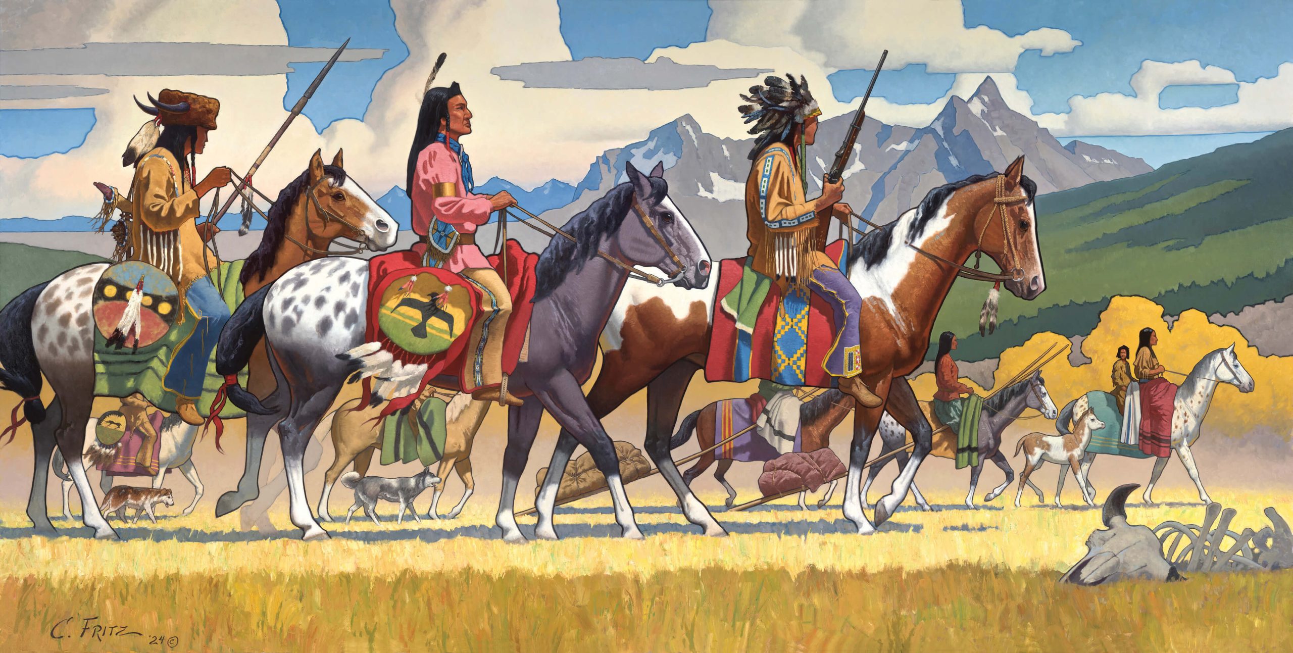 These days, Fritz opts to stay closer to home, working primarily from Montana and the Southwest. But he continues to pursue projects that challenge him creatively. One such project was a recent, private commission of an expansive Western scene, completed for a home in western Montana. Spanning an impressive 7 by 14 feet, the artwork depicts Chief Joseph and the Nez Perce during their 1877 flight and trek up the Bitterroot Valley. The work is a masterpiece of engineering, involving custom stretcher bars from New York, canvas from an 8-foot loom in Italy, an angled frame to ensure viewers can see the painting clearly despite its spot high on a wall, and about a dozen installers to help with the job.