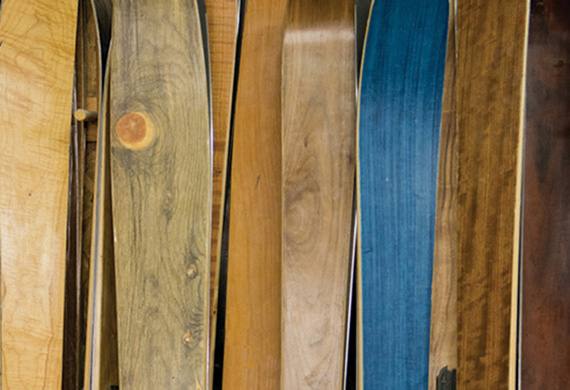 The irony isn’t lost on Parris that he went from building robots to a handmade craft, in which he does everything in his power to avoid using robot-manufactured goods. “I grew up doing carpentry and realized pretty quickly how much I liked working with my hands,” he says. Parris uses white ash to absorb vibration, hard maple for its responsive qualities, and Douglas fir for lighter-weight riders, splitboards, and touring setups. “Hard maple is used in the armatures of instruments because it resonates a true tone that’s comparable to the feel of snow,” Parris says. “Ash is used in baseball bats, axe handles, and paddle oars for their absorption factor.” And for the veneers, he uses a variety of exotic woods.