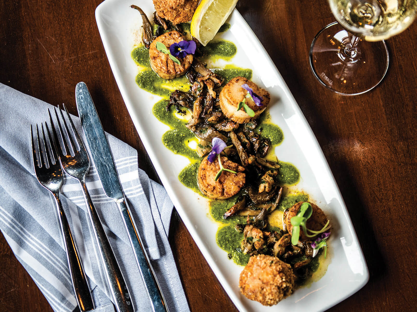 Rich diver scallops, blackened to perfection in clarified butter, are paired with arugula pesto, local SporeAttic mushrooms, bacon arancini, and grilled seasonal vegetables, making for an exceptional and surprisingly filling meal.