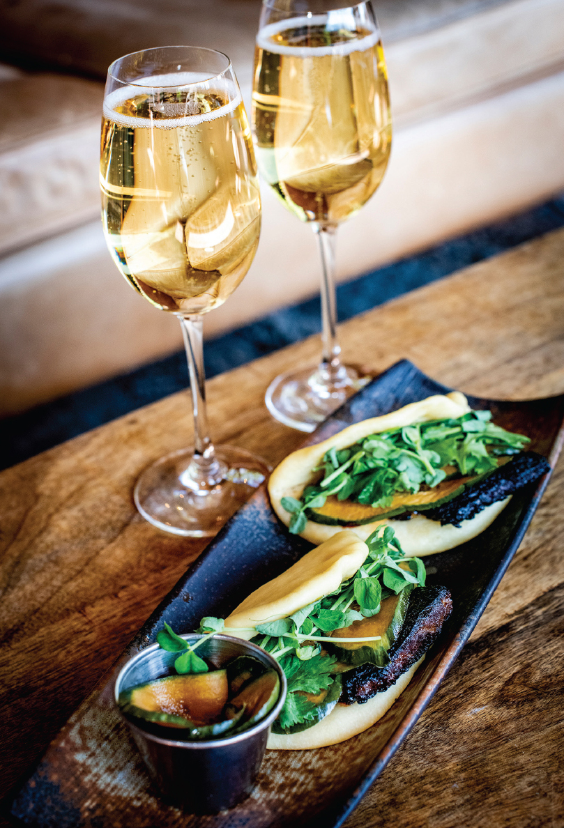 - Char Sui Pork Belly with steamted bao buns, sriracha mayonnaise, spiced cucumber, and pea shoots, complemented by champagne.