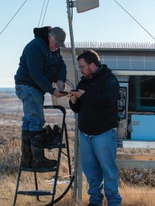 Barthelmess explains to neighboring Phillips County rancher Aaron DeVries the communications link between the tower that connects GPS-connected satellites to his cattle herd’s collars. | RANCHERS STEWARDSHIP ALLIANCE
