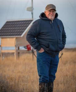 Barthelmess stands in front of a communications tower that connects his herd’s electronic collars to satellites in an area with limited cell service. | RANCHERS STEWARDSHIP ALLIANCE