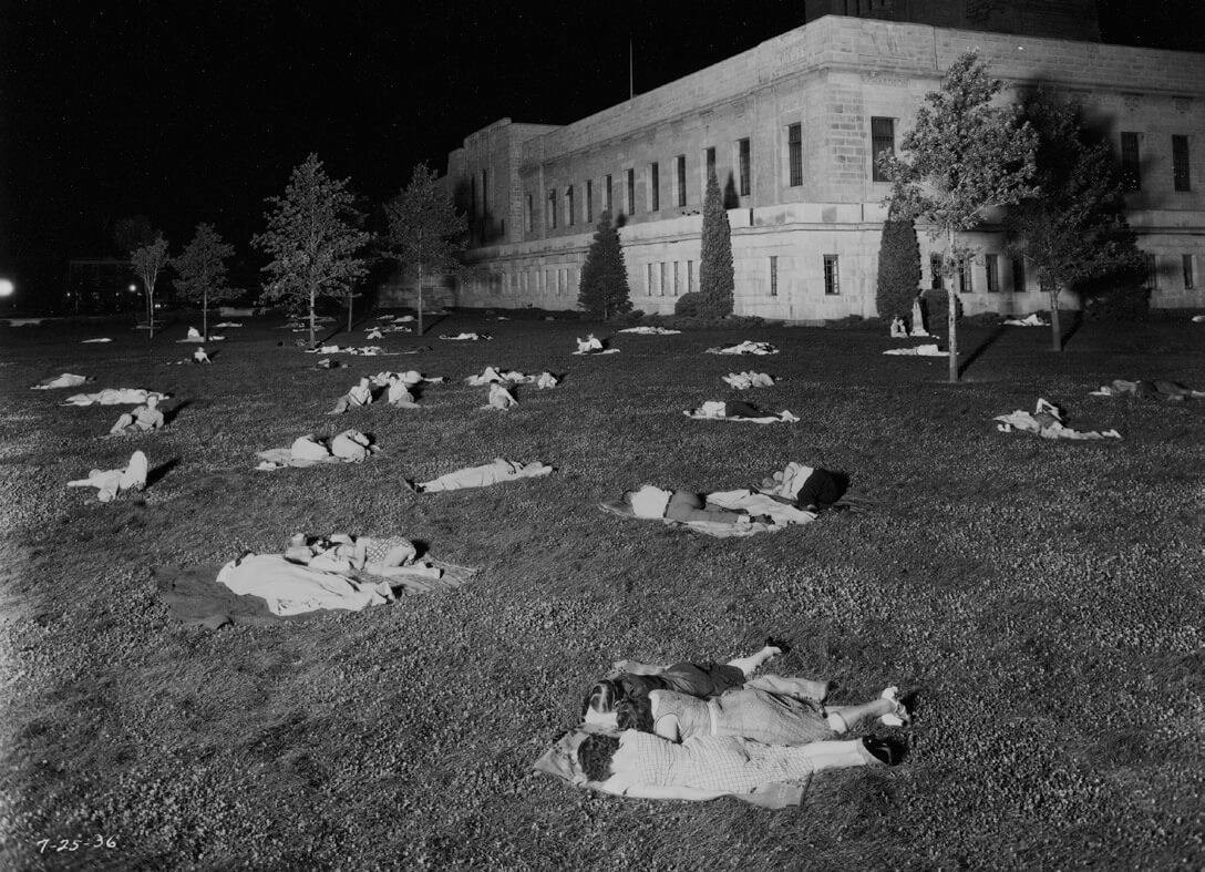 The relentless heat waves of 1936 occurred before air conditioning was widely accessible. Under those circumstances, Americans sought relief through any means available. An overnight minimum temperature of 91 F preceded sunrise on July 25, the day that Lincoln, Nebraska established its all-time record high of 115 F. This image poignantly conveys the misery and daunting challenge that people endured night after night during the peak of that record-breaking summer. | NEBRASKA STATE HISTORICAL SOCIETY