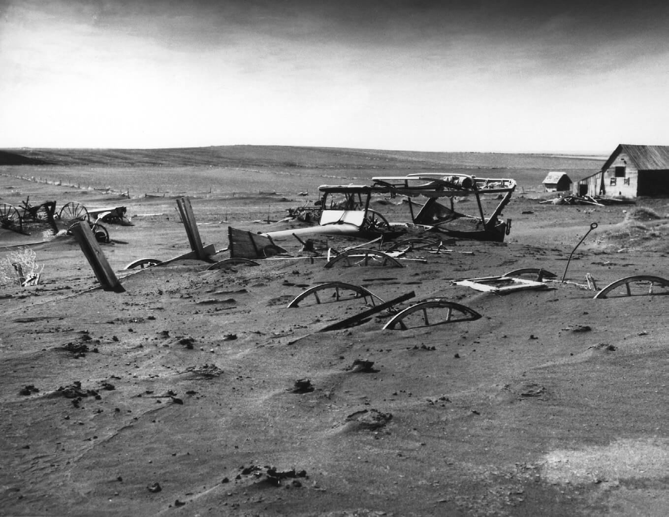 This image superbly symbolizes wrecked livelihoods — the microcosmic manifestation of damage caused by dust storms, which remain the meteorological icon for the Great Depression. Montana and the Dakotas were significantly impacted by dust storms, particularly from 1934 to 1936, but the true epicenter of the Dust Bowl circumscribed the panhandles of Texas and Oklahoma, plus adjoining portions of New Mexico, Colorado, and Kansas. | UNITED STATES DEPARTMENT OF AGRICULTURE