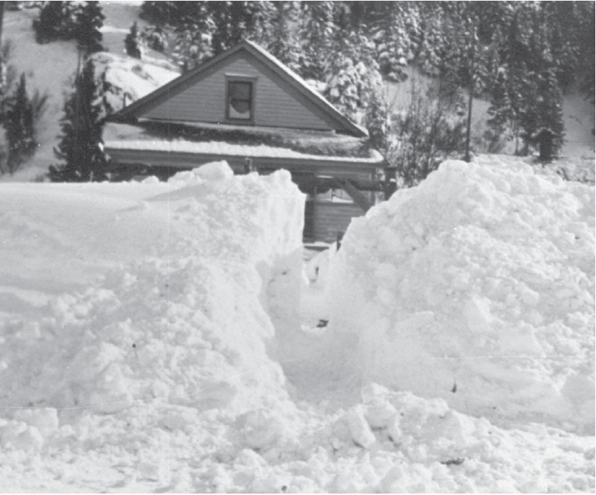 Surprisingly few photographs, if any, survive as documentation for Missoula’s all-time record snowstorm, which dumped 19.6 inches of snow on February 12, 1936 and, over three days (February 11–13), a total of 28.5 inches. Dave Noble, a meteorologist for the National Weather Service in Missoula, regards this event as the product of “an anomalous plume of moisture, possibly an atmospheric river, overrunning the Arctic air already in place.” This interpretation, he adds, is strongly supported by precipitation records for February 12, which illustrate a pattern of heavy snowfall, one that extended from the Sierras to the Northern Rockies, with “up to 30 inches [reported] in the Flathead [Valley]” and, far to the east, 13 inches in Billings. | ARCHIVES AND SPECIAL COLLECTIONS, MANSFIELD LIBRARY, UNIVERSITY OF MONTANA