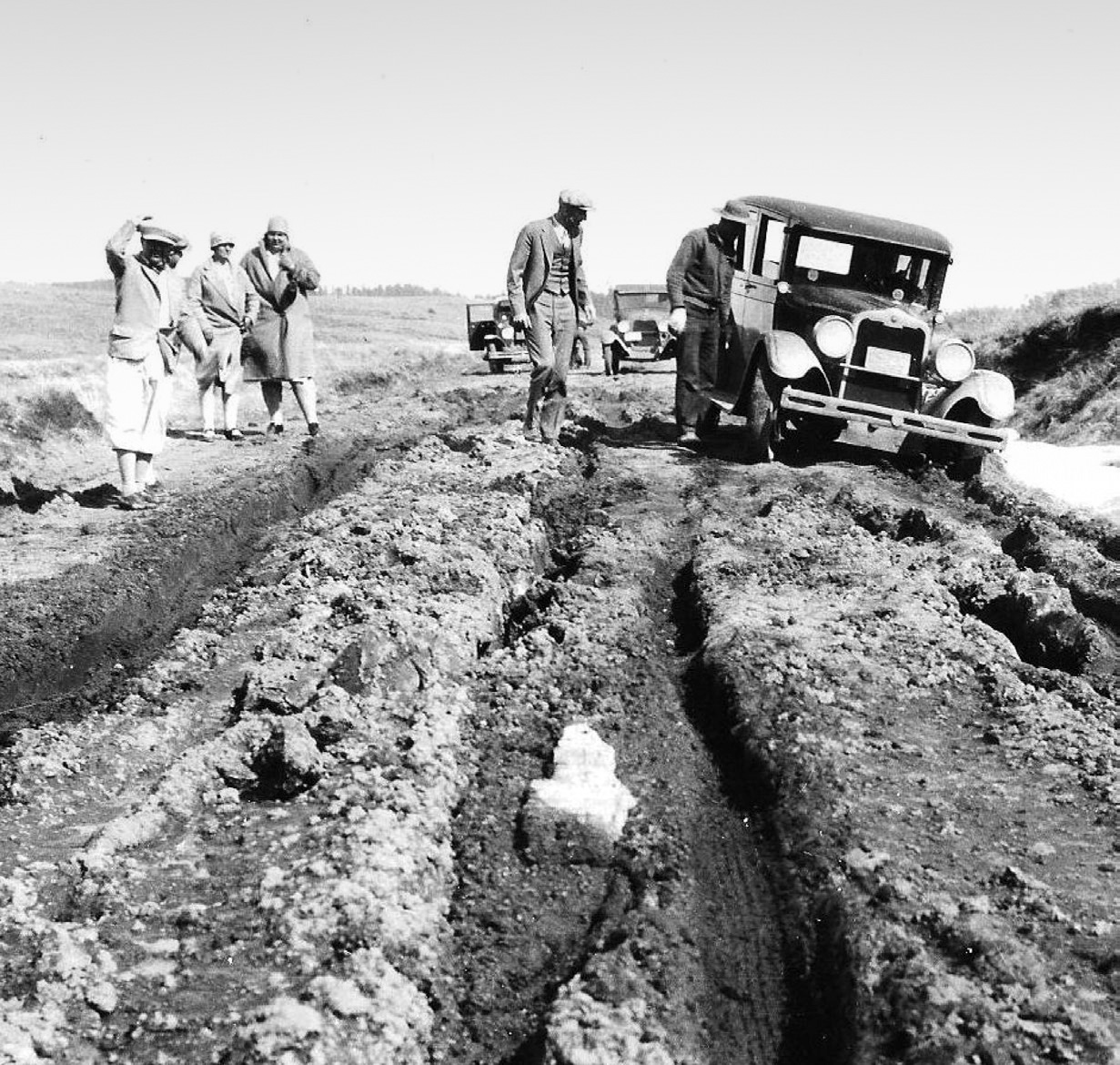 Reality could be far muddier than the advertisement depictions for early park travel, as demonstrated by this image — probably from the late 1920s — of autos struggling to negotiate rutted dirt roads in Yellowstone’s Lamar Valley. | National Park Service, Yellowstone National Park Library, Yellowstone National Park Photographs