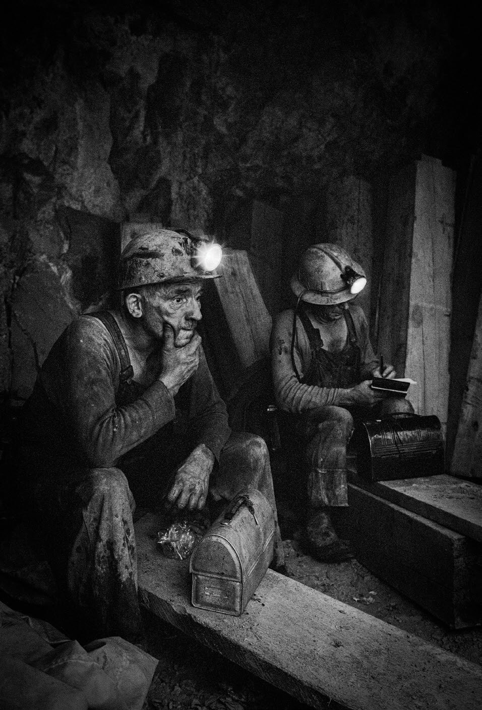 Miners at Butte’s Mountain Con Mine pause for their 30-minute lunch break. They opened dented “oyster can” lunch pails that contained warm, hearty Cornish pasties, wrote letters, and rested.
