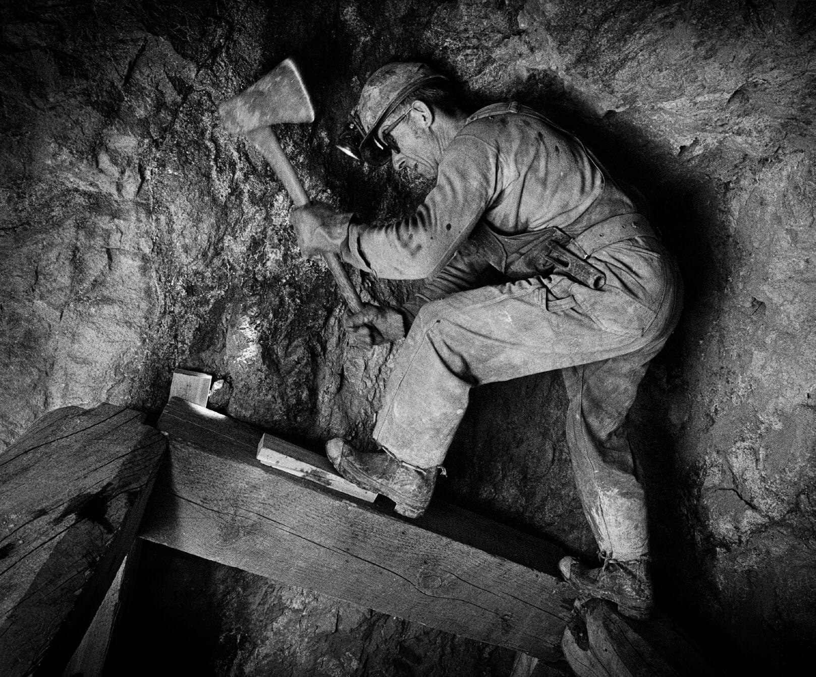 A “timbering” miner wields an ax, driving spikes into a beam to secure the framework. This dangerous work — in dim, dusty conditions — braced tunnels against collapse.