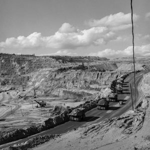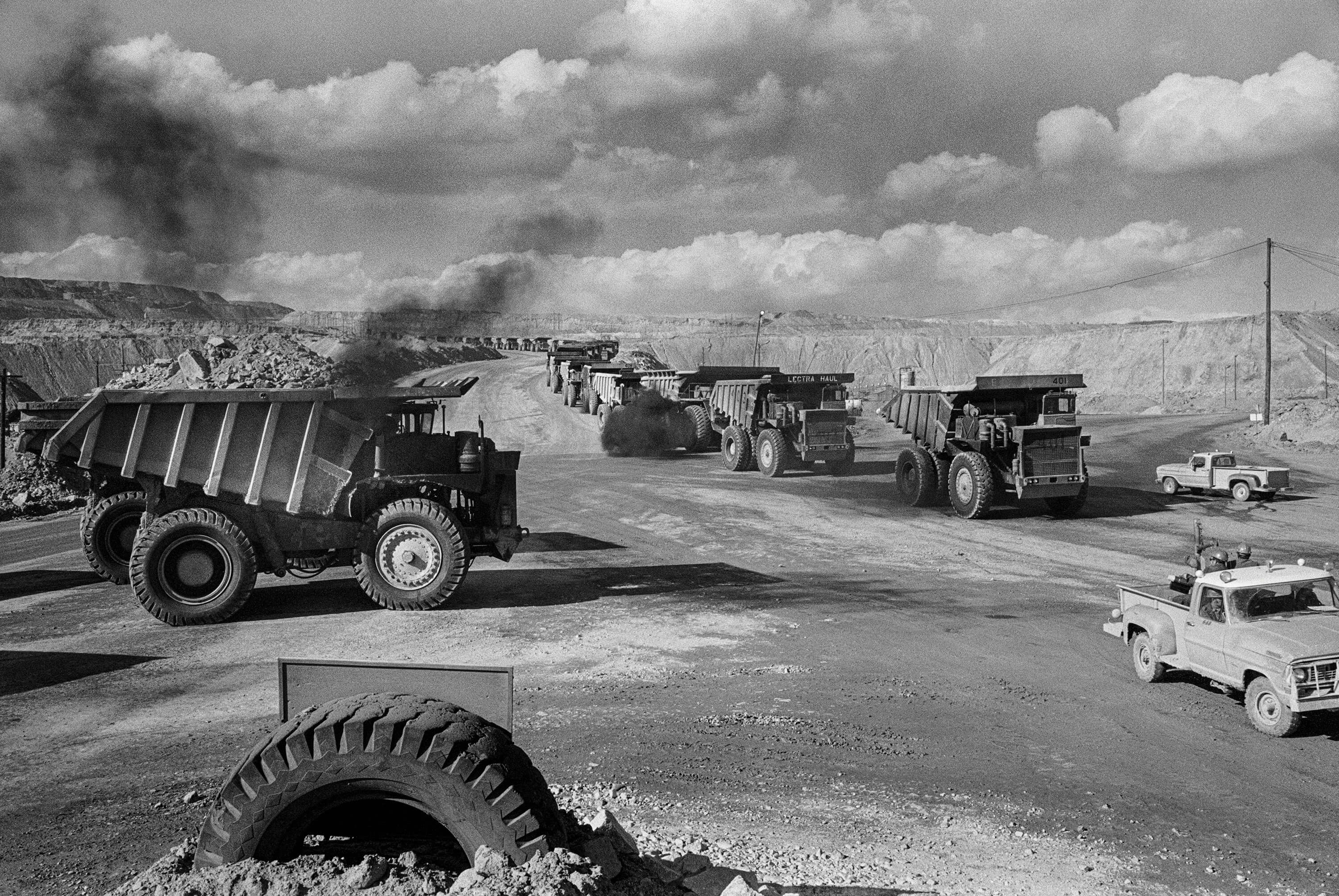 Massive 200-ton “ukes” (Euclid trucks) haul copper ore through Butte, Montana’s Berkeley Pit in 1973, as the Anaconda Copper Mining Company ramped up production to as much as 40,000 tons daily, transforming Butte’s landscape. Open-pit mining far eclipsed the production of hard-rock miners underground.