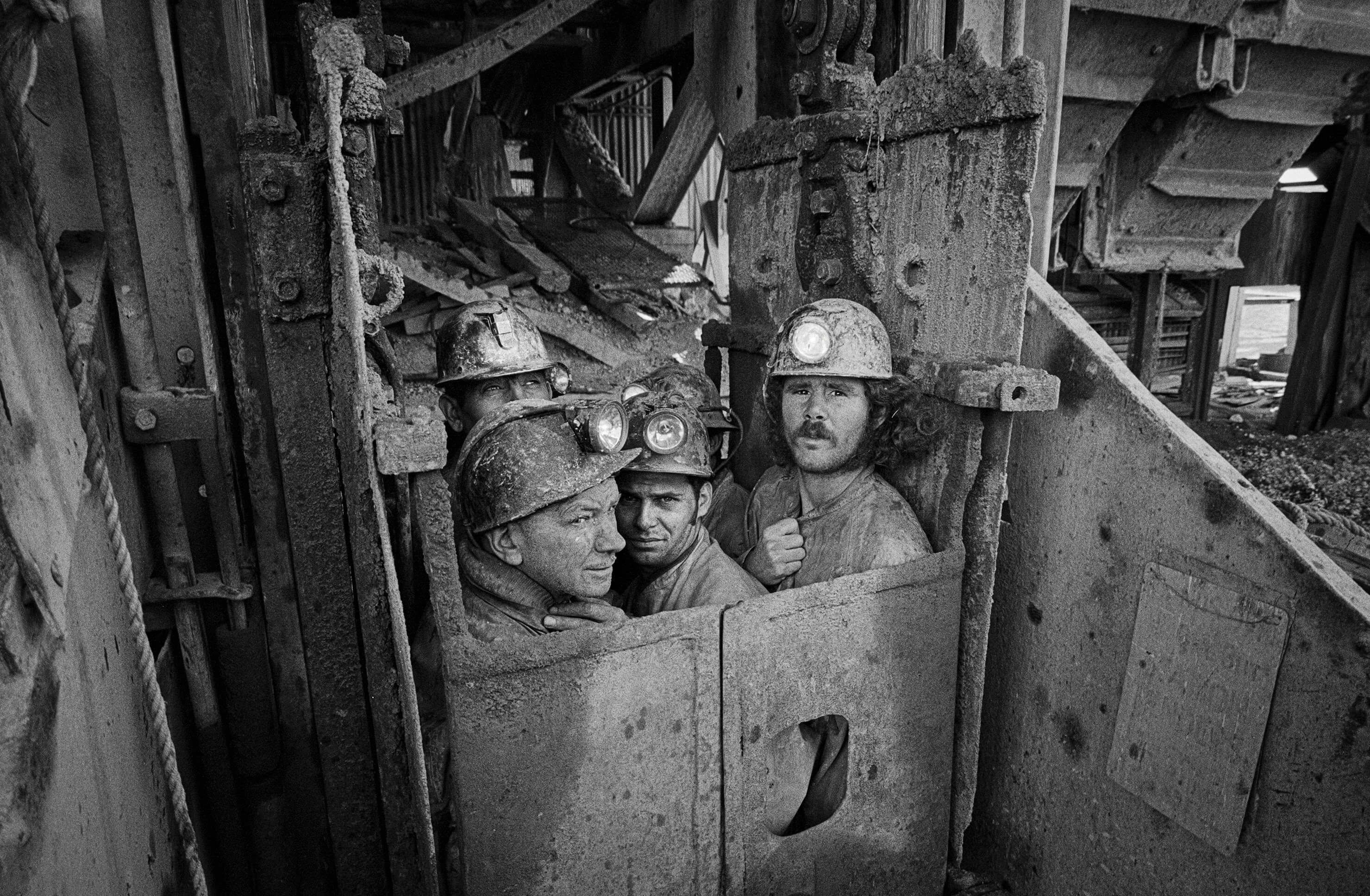 At Mountain Con Mine, copper miners in helmets and headlamps squeeze out of the cramped “man cage” — typically carrying six to seven men and their gear — gripping their mud-splattered and water-soaked clothes as they emerge into daylight.