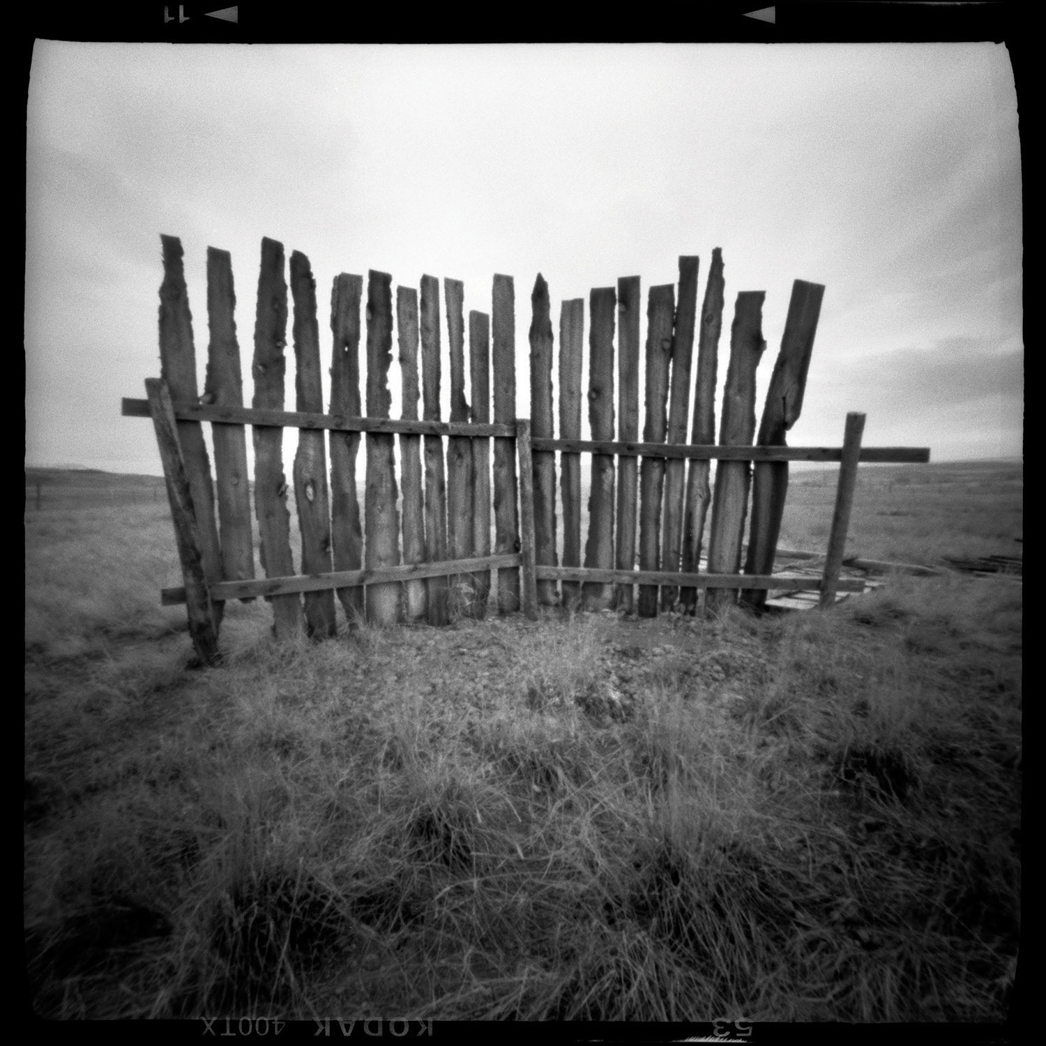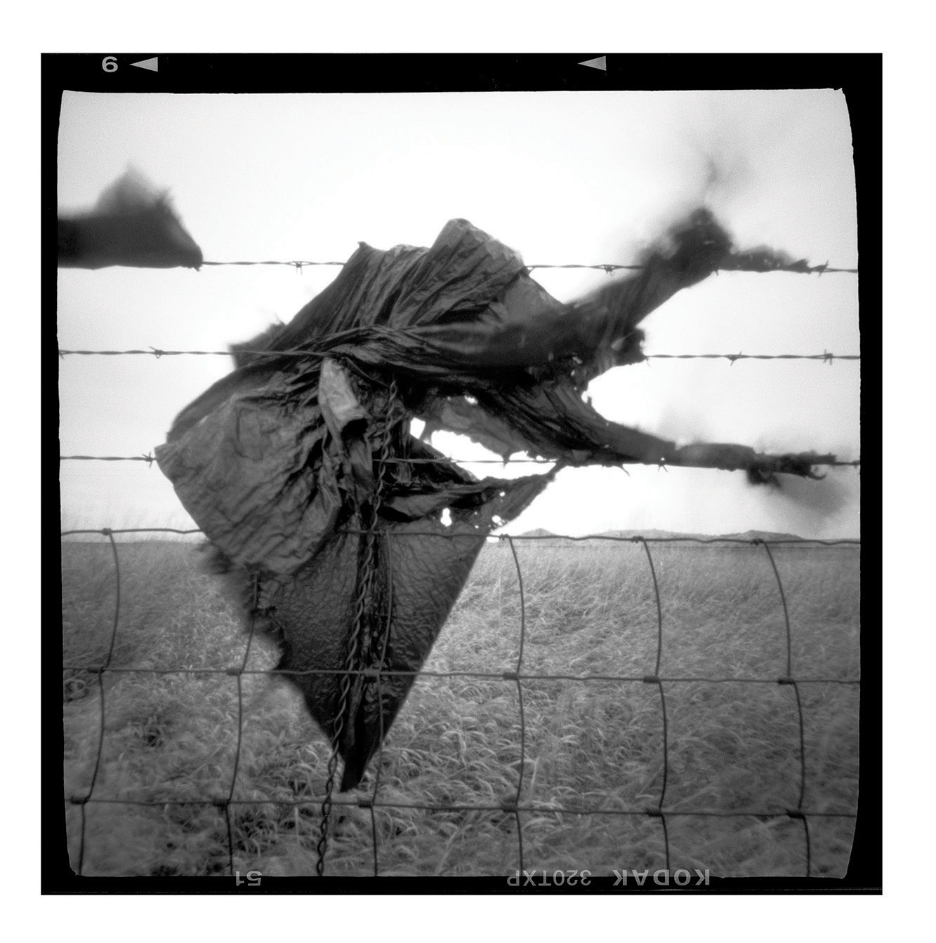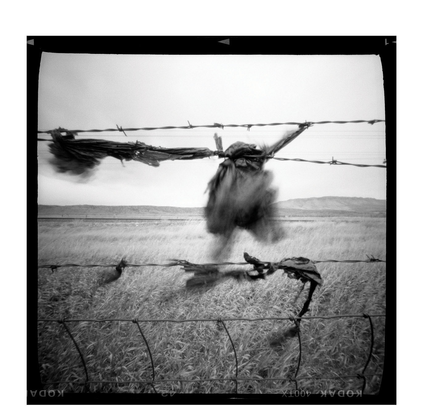 Tie Wire –the photographer discovered another low-tech happy accident with this one. “I was think- ing of these wires as black lightning against the dark sky, and when I developed the film, I discovered the ‘burn marks’ at the bottom of the frames caused by a light leak,” Ferris says.