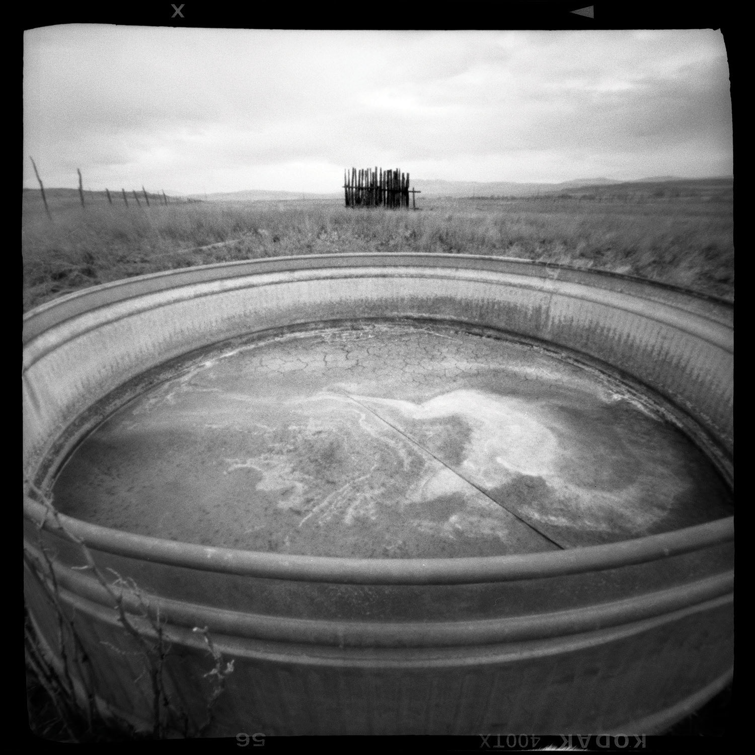Clockwise from top left: Great Basin Rye Grass – Ferris was drawn to this roadside attraction due to its resemblance of a “Montana peacock” or phoenix. • Wind Fence & Stock Tank – Ferris stopped to photograph this fence and noticed the stock tank just as he turned back to the car. “Two photographs I like in 10 minutes, that’s a good day for me,” he says. • New Tumbleweed II – the film ended up buckling in the box camera and curved the edge of the photo. “I consider it a happy accident,” Ferris says.
