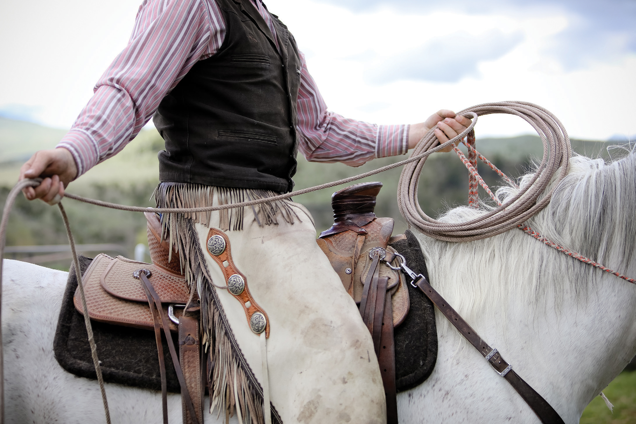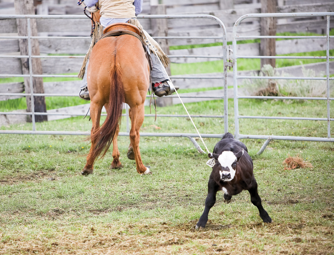 - A roper holds the reins of his horse while coiling his 40-foot-long lariat. With a relaxed wrist, he’ll swing the rope above his head and carefully release the noose, aiming at the hind legs of a calf.