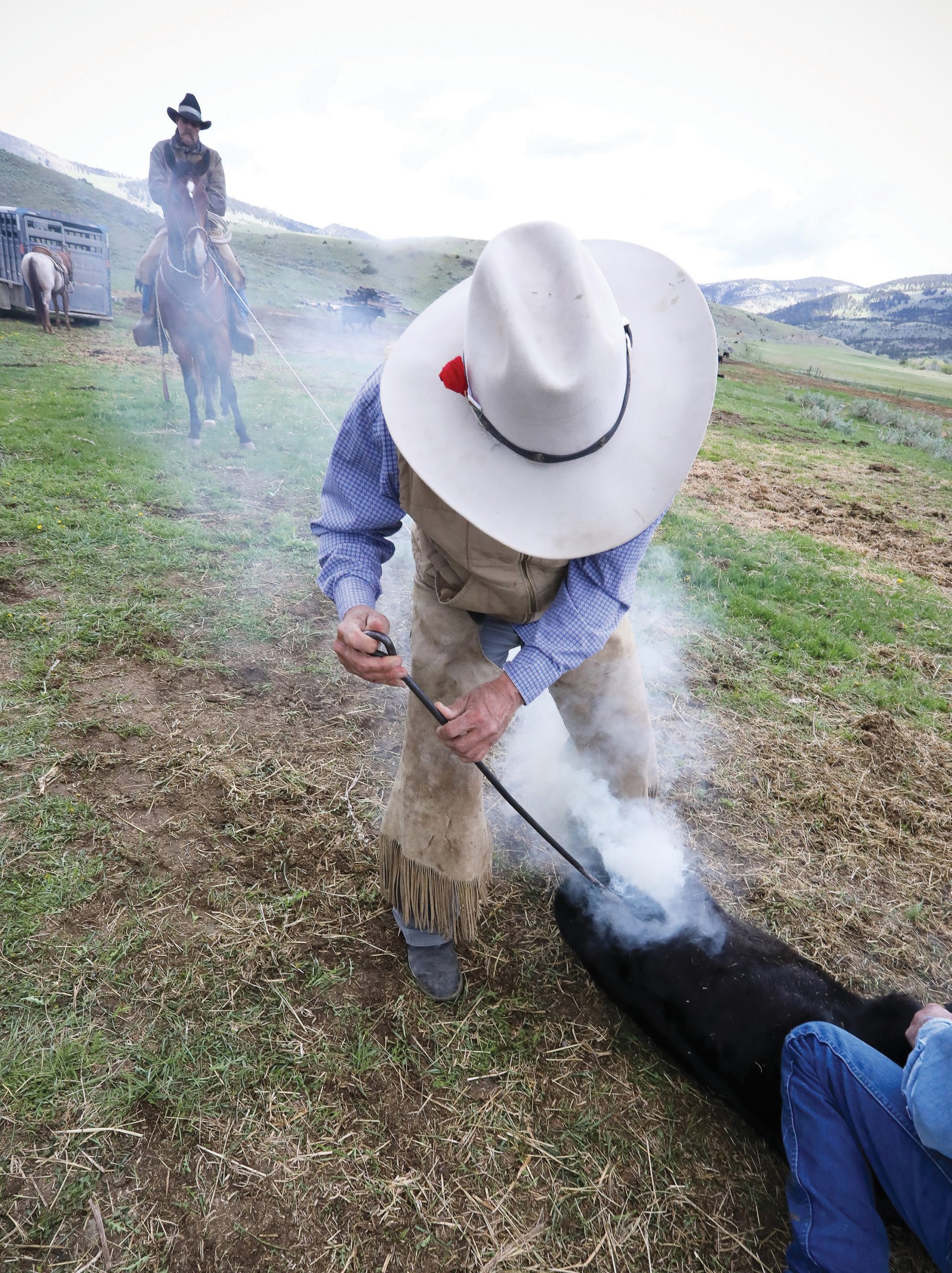 - Frank Anderson, owner of the Climbing Arrow Ranch, carefully marks a calf with his family’s brand. On horseback behind him, Lyle Jordan, a retired Montana brand inspector who has worked on the Climbing Arrow for 25 years, keeps tension on his lariat to help keep the calf still.