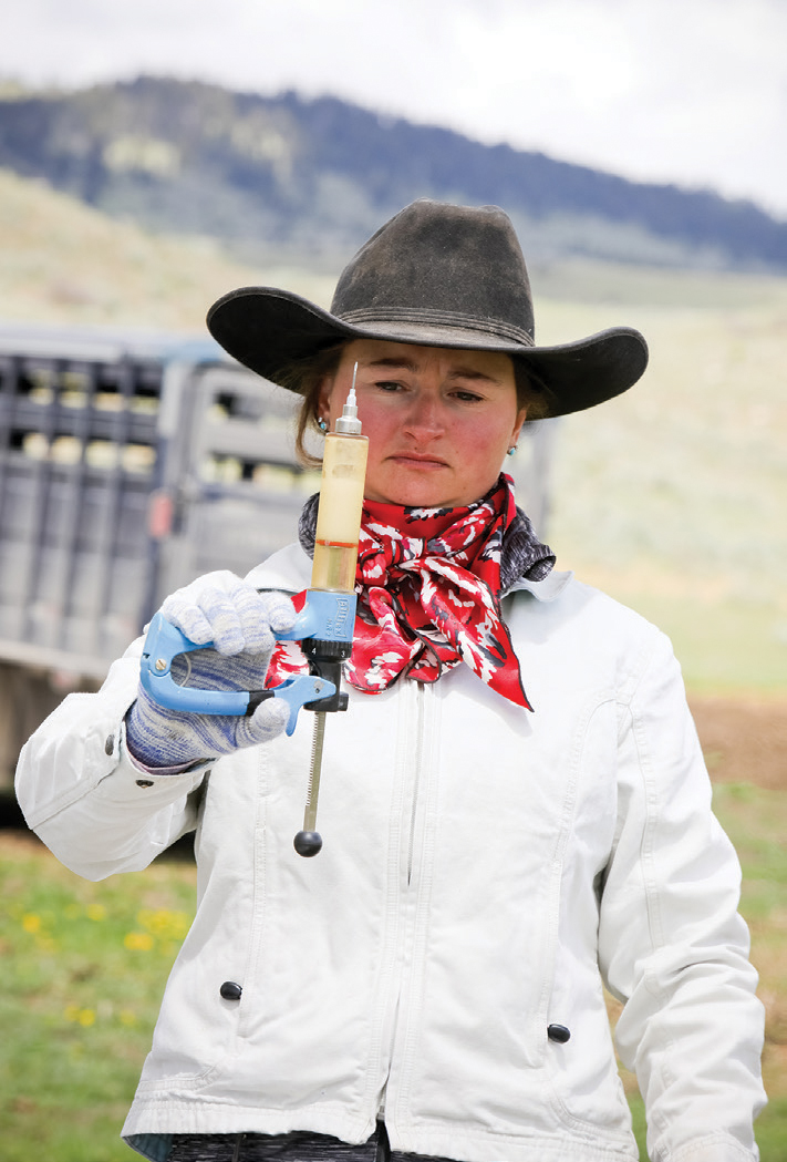 - Abby Brogger, the daughter of custom saddle maker Marc Brogger, prepares to inoculate the next set of calves. She has been riding horses and working on the Climbing Arrow Ranch since she was 5 years old.
