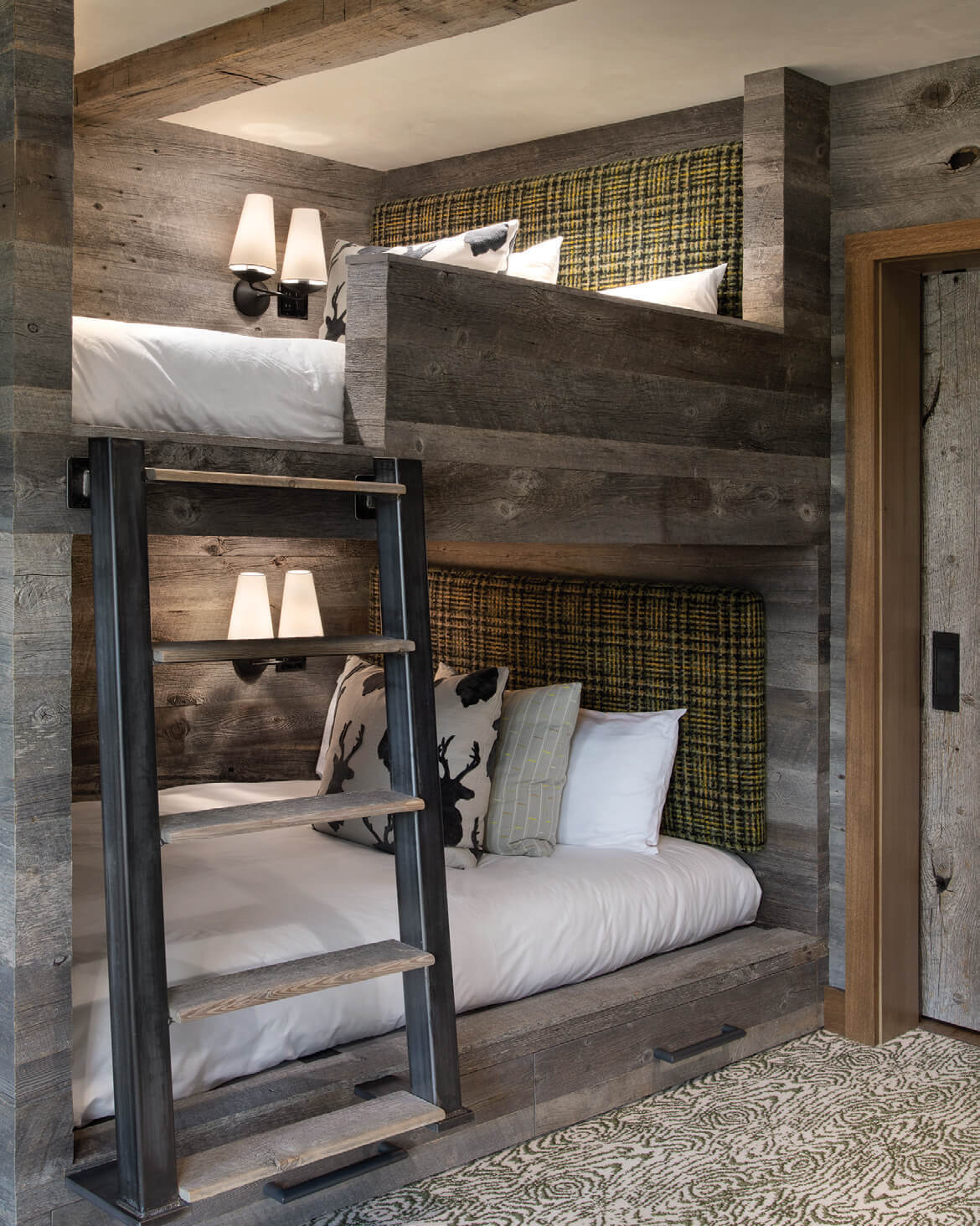 Eschewing the emphatic rusticity that can come with antiques, almost all of the home’s interior furnishings and features are new — from the kitchen’s custom glass lighting fixtures, designed by Bozeman artist Ona Magaro, to the family room’s cloud-like Restoration Hardware sofa. But there is one piece that’s very old: An antique stone wheel of Chinese provenance sits near the top of the stairway, holding all the untold stories of its travels. The wheel’s soulful quality is echoed by that of the reclaimed lumber used throughout the house, all sourced and provided by the contractor, Chris Lohss, of Lohss Construction. He utilized old-surface wood (which bears the original saw marks from when it was first cut) from a pair of 140-year-old Midwestern barns he bought and salvaged.