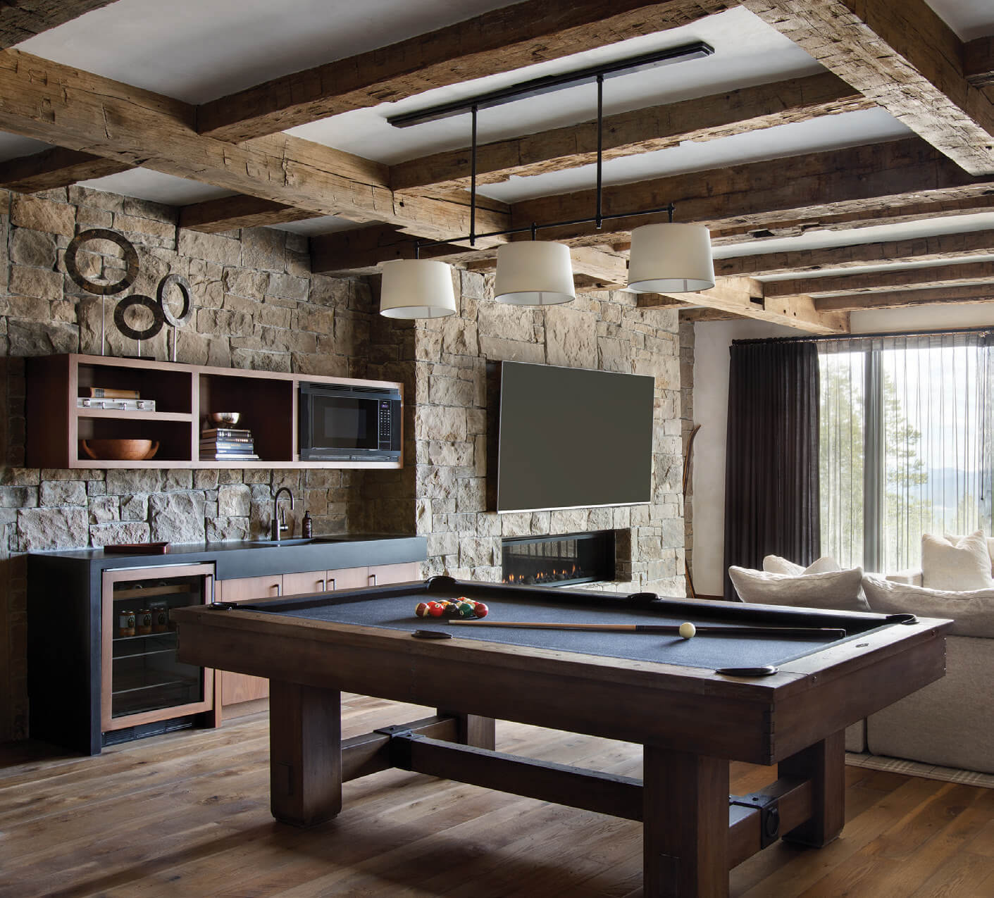 - A pool table, mini kitchen, and plush sofa from Restoration Hardware’s Cloud Modular Collection create an inviting place to gather, relax, and savor the mountain views in the family’s recreation room.