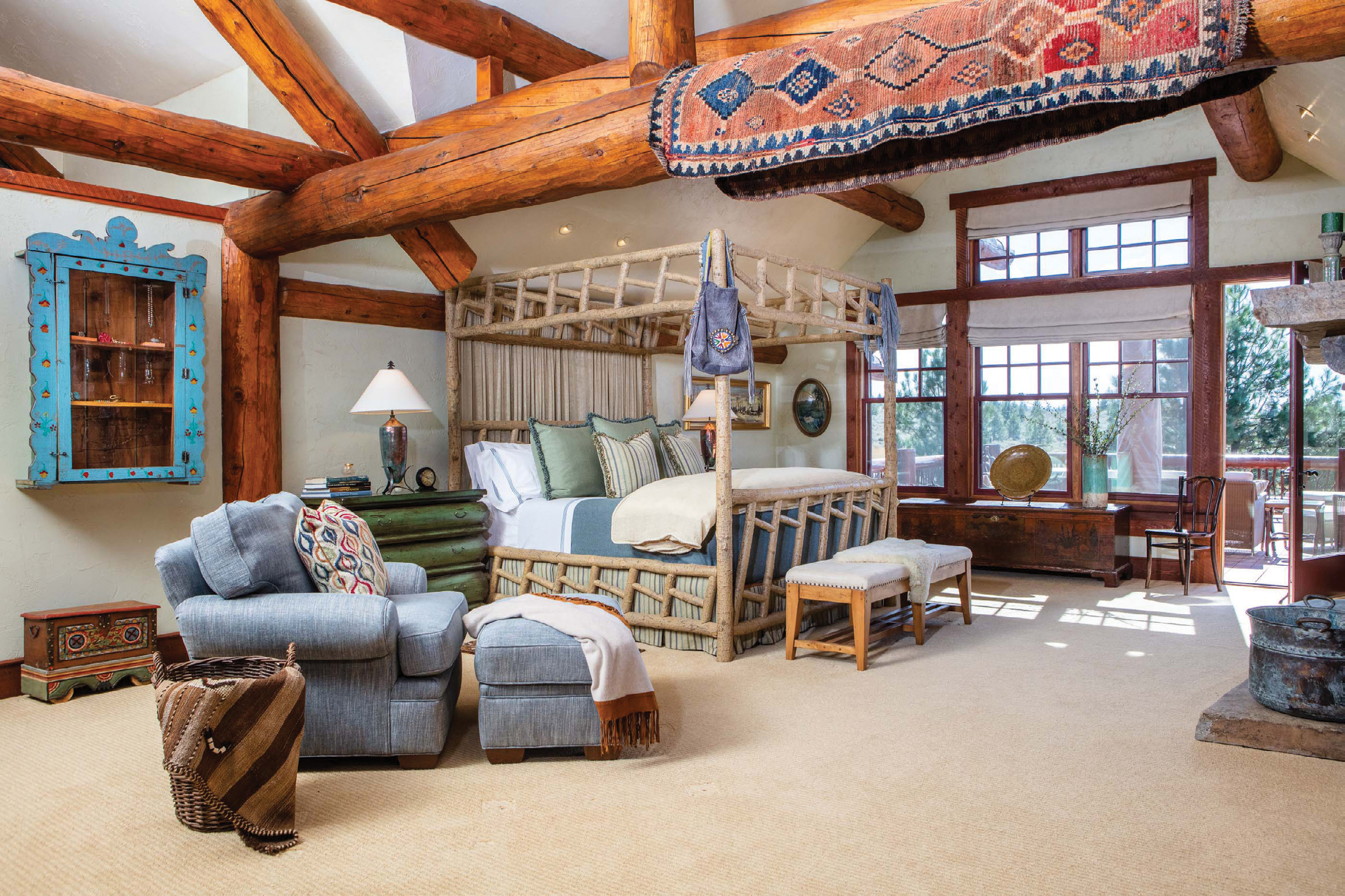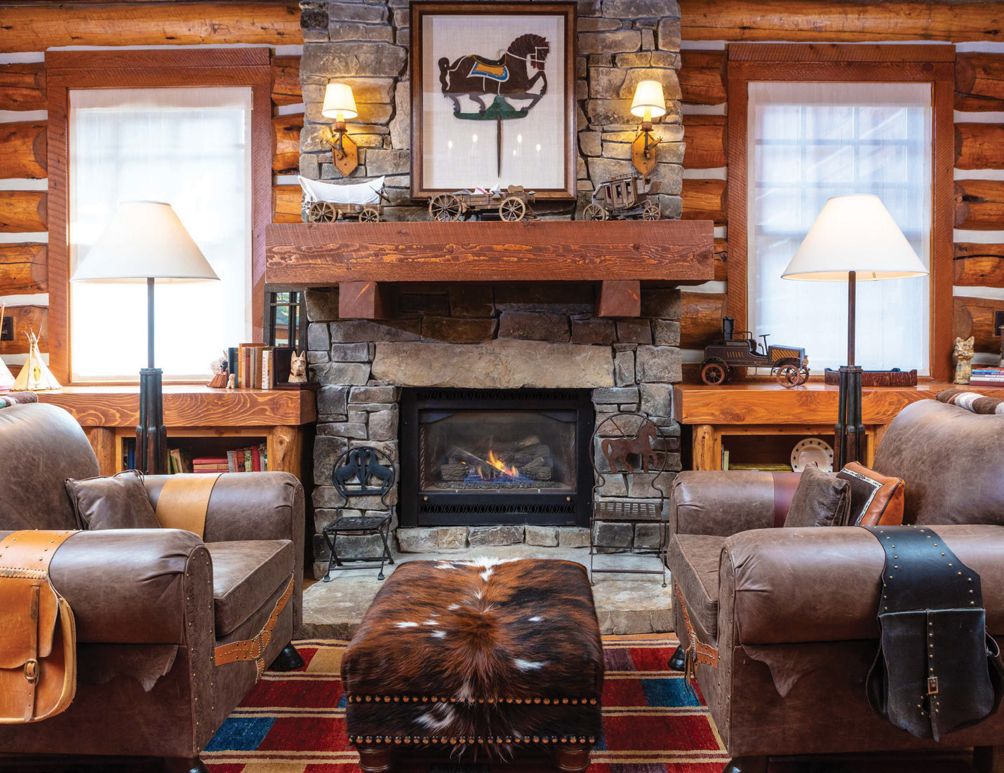- Cialone intentionally left some of the Western, more masculine touches, such as some of the furnishings and fabrics in this sitting room, in order to more clearly define the spaces.