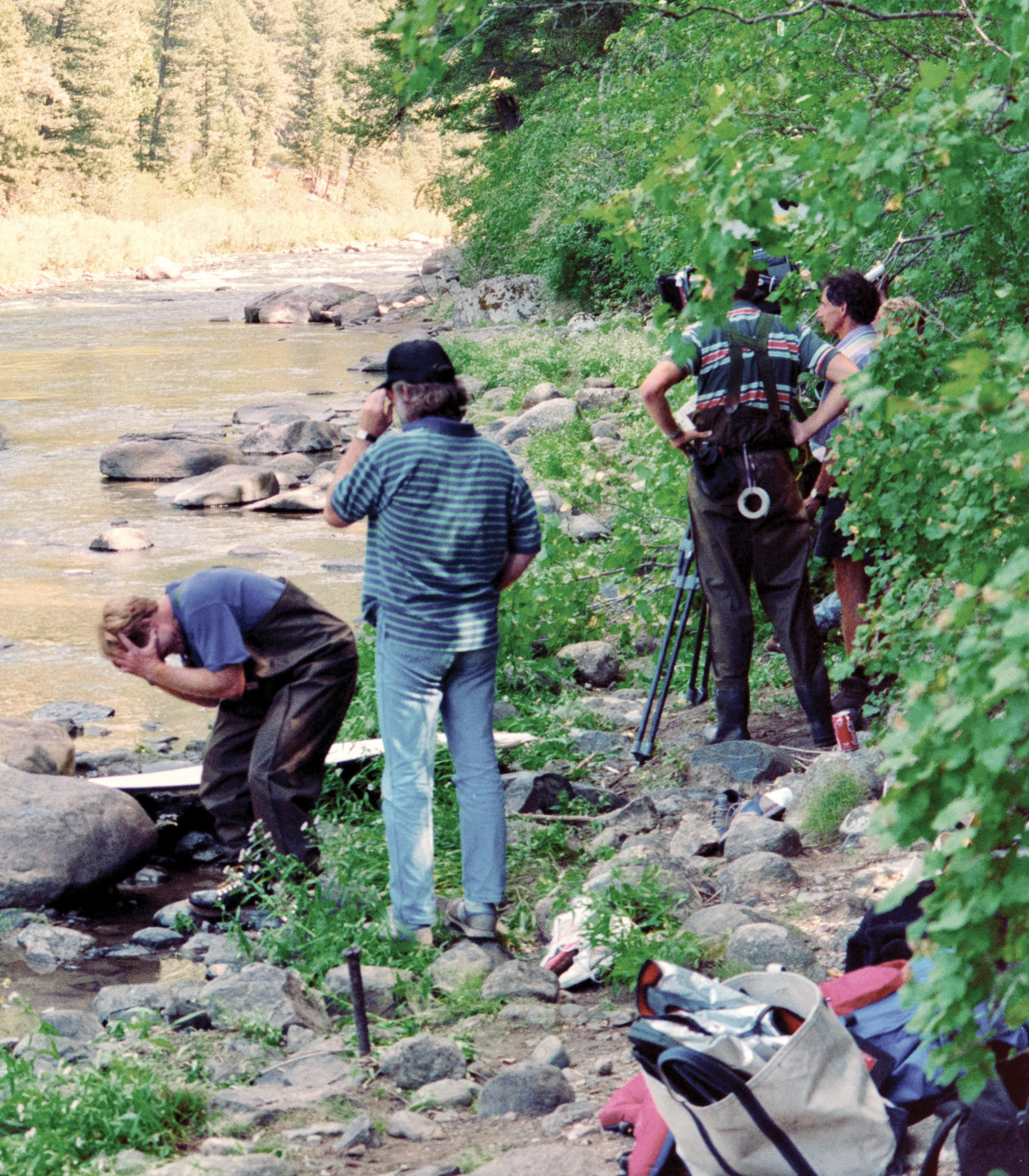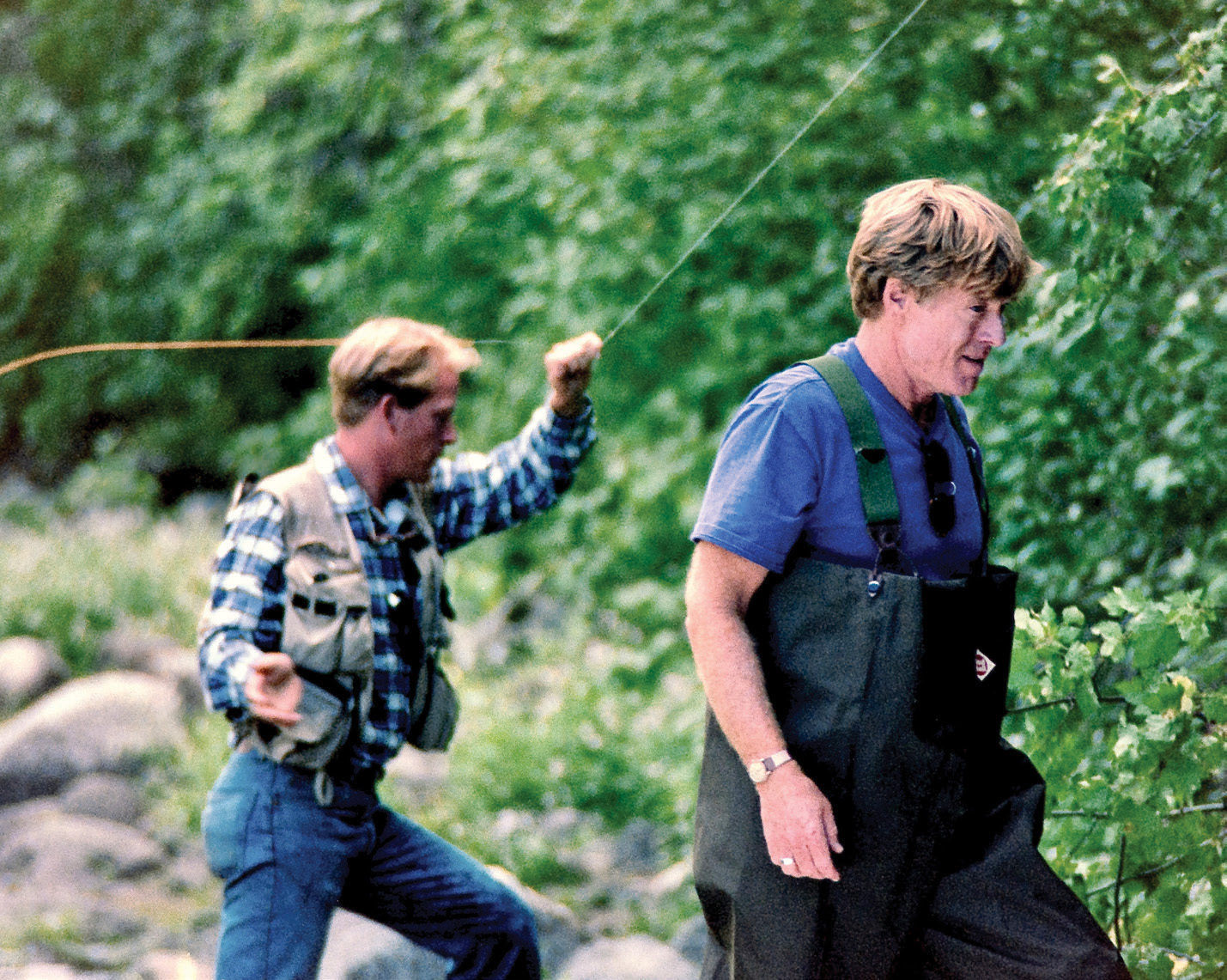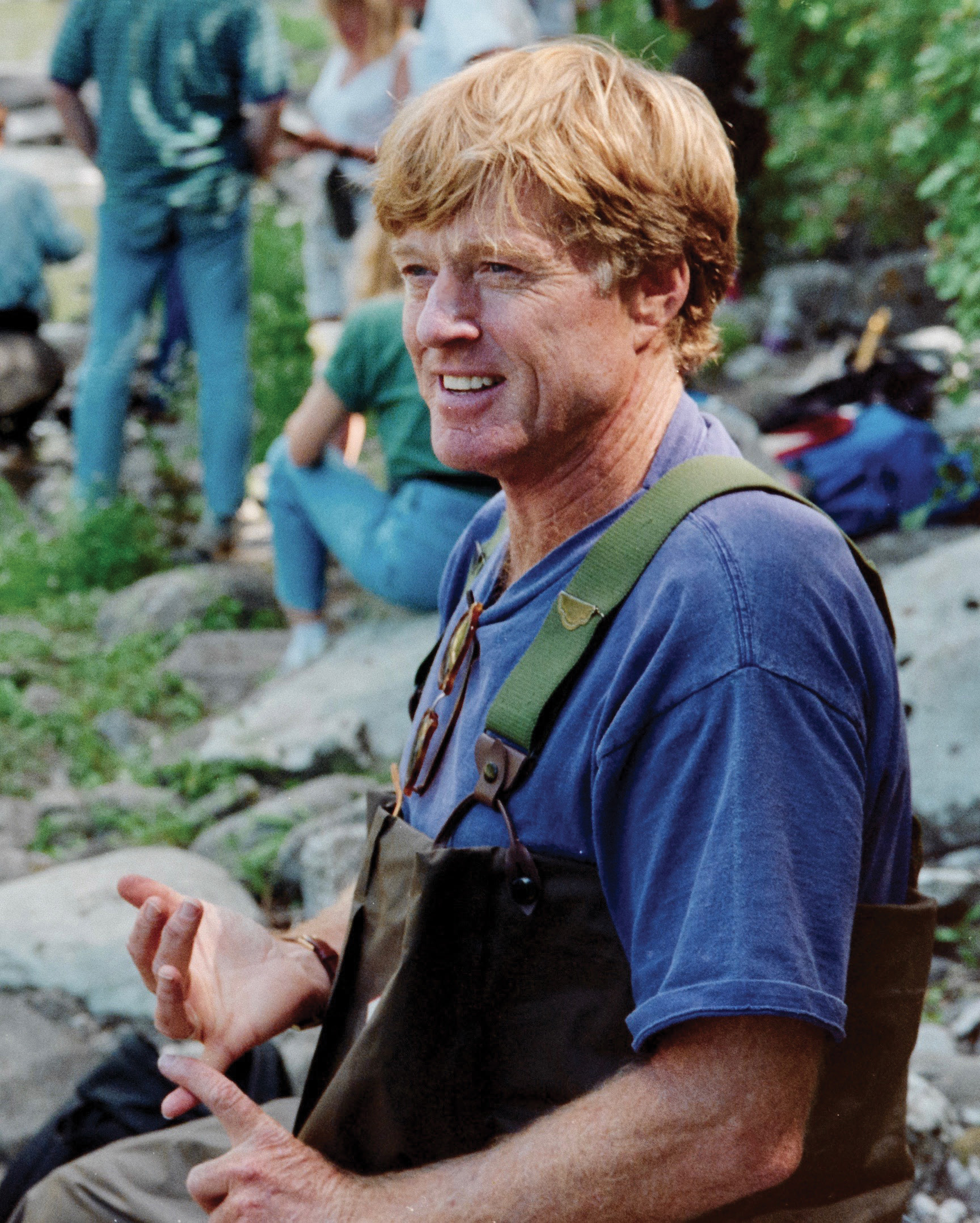 Redford was dressed in green, chest-high waders and a purple T-shirt, his nose smeared with sunblock. Earlier in the afternoon, he waded into the river — teeter-tottering his arms to maintain balance — searching for camera angles. At one point, while moving out into the river’s deeper currents, he stumbled into the water. Quickly recovering from the cold dunking — eyes lit up like a kid who just won a bet on a dare — he continued forging his way down river as if nothing had happened. The film crew scarcely reacted.