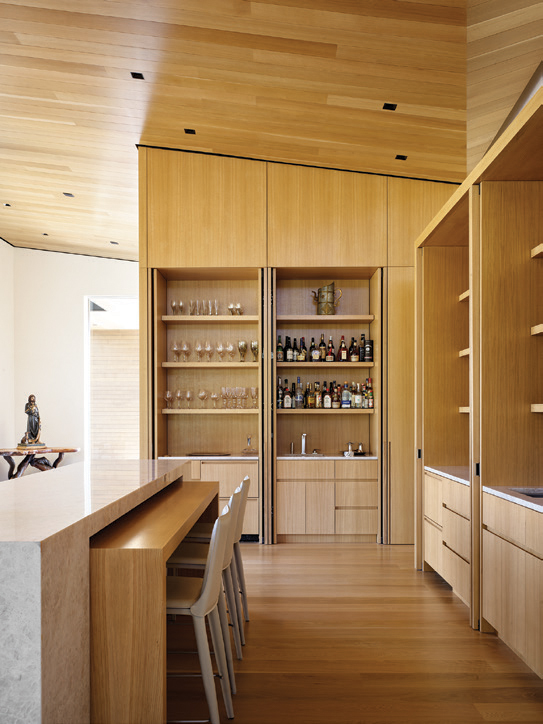 Features that tie the interior to the exterior include quarter-sawn white oak cabinetry in the kitchen, white oak floors, and wooden louvers that Logan describes as a kind of sculptural divide separating the kitchen from the living area.