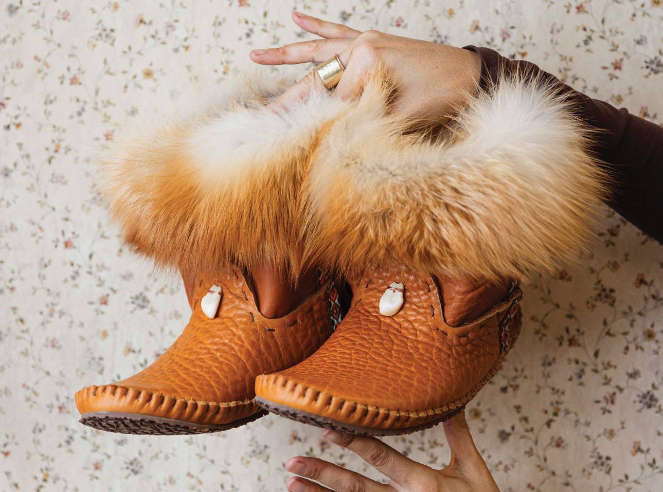 Shauna White Bear’s moccasins blend traditional Indigenous craftsmanship with contemporary flair. The durable mocs are crafted from bison leather and customized based on the wearer’s taste with fur, decorative rivets, and lace. White Bear, who lives in Bozeman, Montana, is an enrolled member of the Mandan, Hidatsa, and Arikara Nation and seeks to motivate younger generations to stay authentic and unique. She recruits Indigenous college students to assist her in the art of moccasin making, fostering an environment of integrity and dedication to the craft. “I hope to inspire young people to use their talents wisely and take control of their lives,” she says.