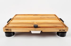 An innovative design for a daily kitchen item, The True Board elevates the classic cutting board’s everyday functionality. With four feet that raise the cutting surface up off the counter, this board made of certified plantation-grown teak allows you to level and unlevel it based on your use. The perimeter groove collects juices and, when angled, those juices run directly into the accompanying stainless steel bowl for a seamless cleanup. A strong earth magnet on the side offers a handy place to rest a knife in between carving and prep work, keeping it off the table and safely out of the way.