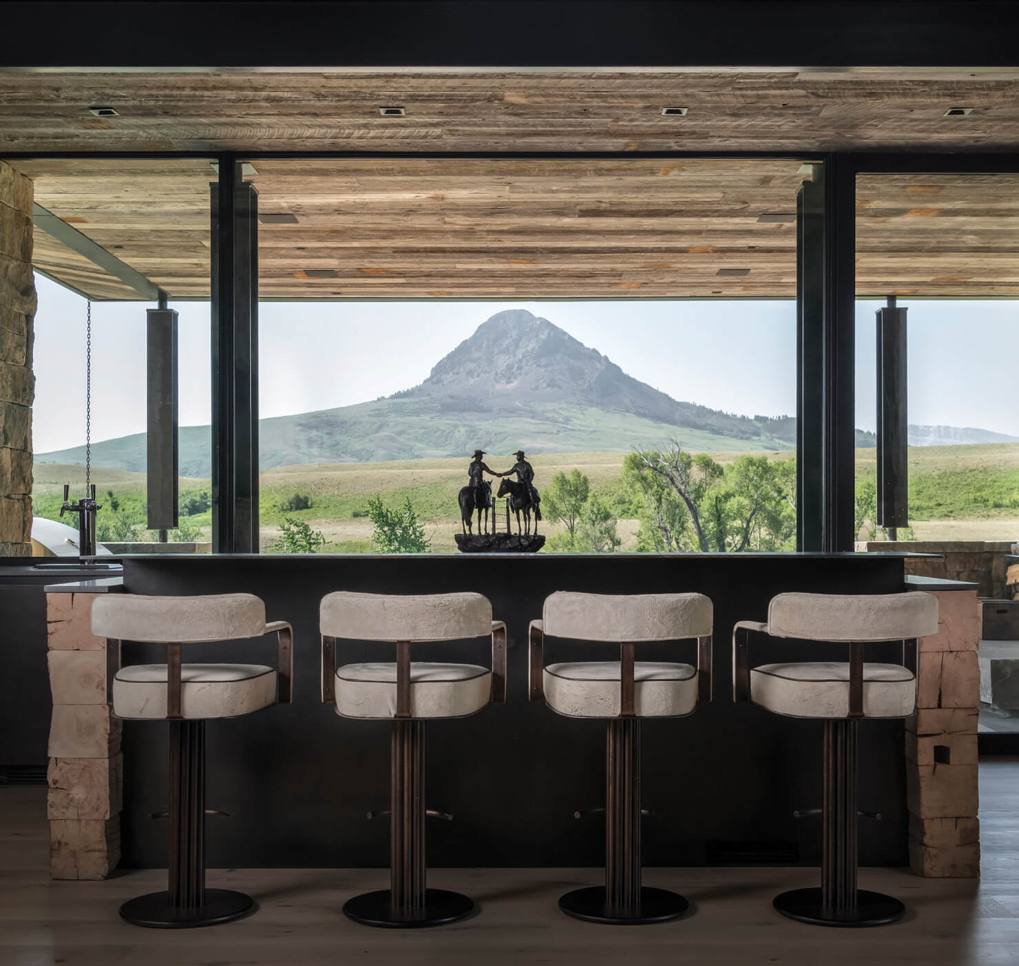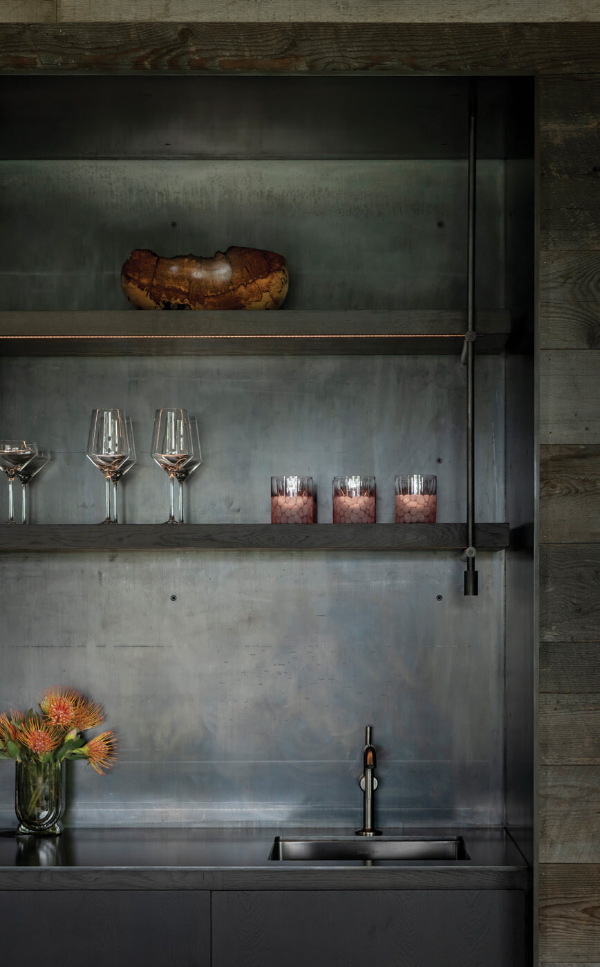 In the lodge’s dining room, a wet bar framed in steel and blackened oak offers a refined take on ranch materials, balancing rugged textures with clean, contemporary lines.