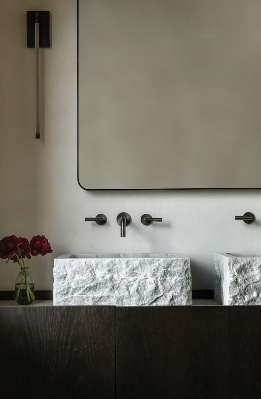 Dual basins, custom cut from white marble, sit atop a dark-stained oak vanity in a guest bath.