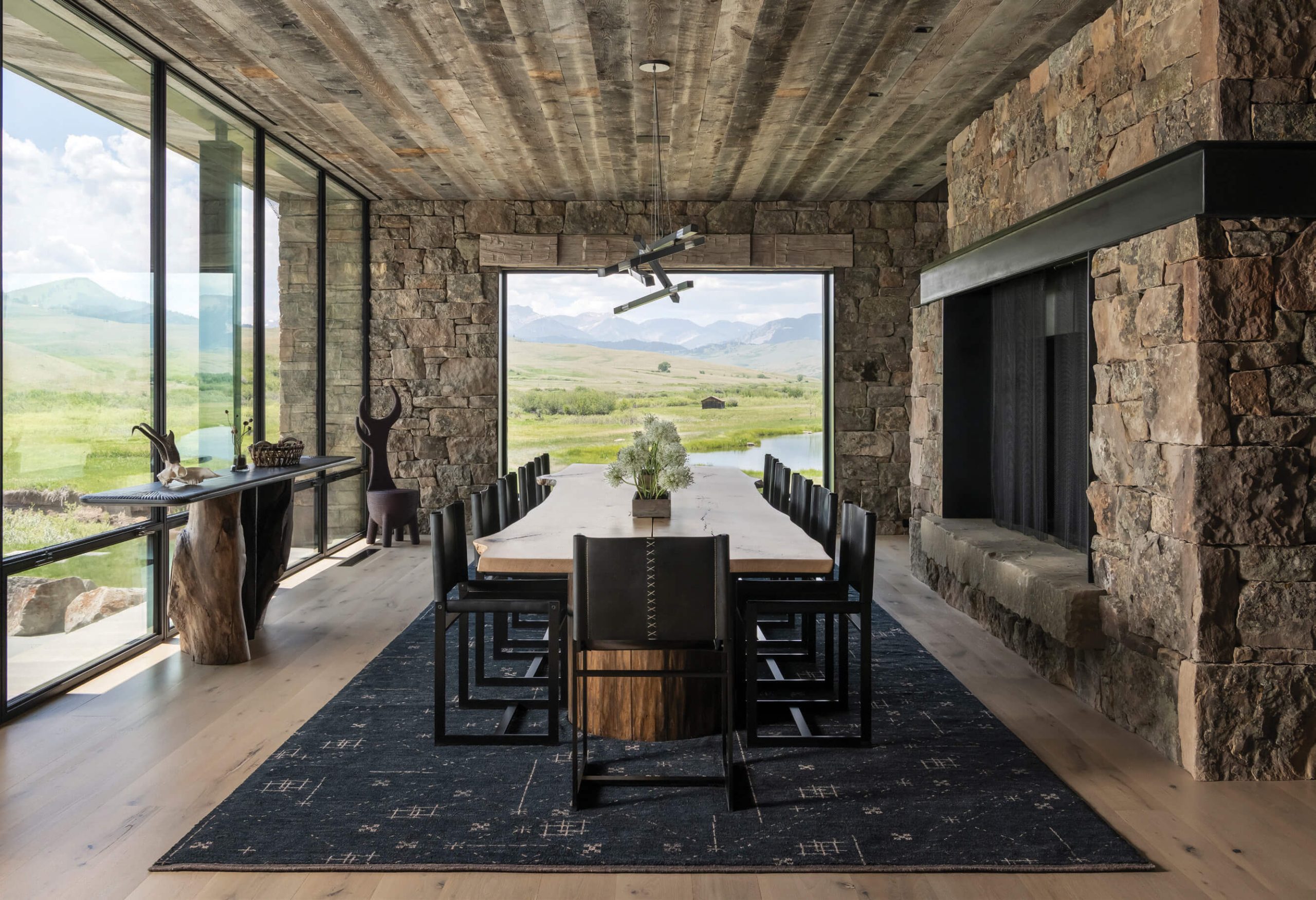 “The goal was to create a sense of quiet luxury while still honoring the landscape and the ranch’s role as a place to gather,” says Cade. Overlooking a mountain peak in the distance, for example, a quartet of hide-upholstered stools and patinated metal shelves in the main lodge’s bar area bring rugged yet refined notes of contrast to the interior’s rusticated surfaces. In the same structure’s dining room, which seats up to 16 people, a tree trunk forms the base of the dining table while a live-edge slab serves as the top. “There’s a specific balance between organic and structured elements — the flowing edge of the dining table draws the eye outward, a sculptural accent chair subtly references antlers, and the console rests on a hollowed tree base,” Cade continues. “Those pieces are grounded by more modern elements like a geometric rug, squared steel dining chairs, and a linear light fixture.” Similarly, the custom table in the dining area of the main house, though more refined, features a petrified wood slab atop a steel base, complementing the linen-textured poured-concrete counters of the adjacent kitchen island and attuning with the environs outdoors.