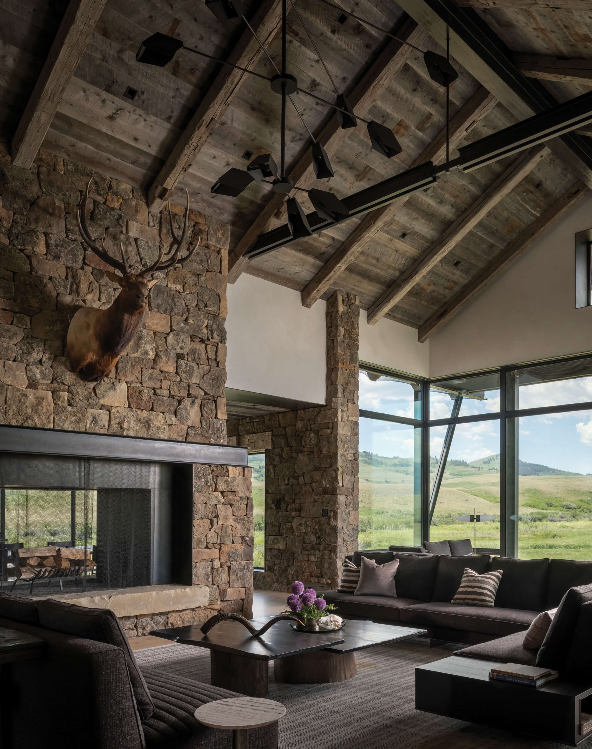 Oversized upholstered seating from Minotti in deep-plum wool surrounds custom coffee tables, creating a cozy gathering place in front of the fireplace in the lodge, where reclaimed timber and local moss rock define the spaces to look historic yet feel modern.