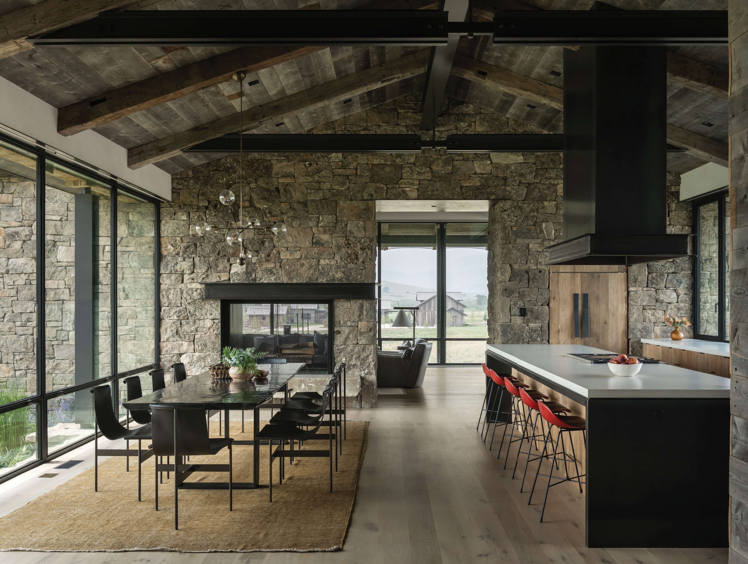 Careful detailing by the architect enabled the artful union of old and new building techniques, while the natural materials palette further engages the structures with the outdoors. The architects chose elements that would gently reference the surrounding landscape while adding timelessness to the compound. They integrated fieldstone sourced from regional quarries and reclaimed timbers and siding, some more than 150 years old. The reclaimed wood clads the exteriors as well as some of the structures’ interior walls, and lichen-flecked stones add character to the fireplace surround, chimneys, and walls. “The ranch vocabulary and native materials create a tactile vibe and make it hard to date the new structures,” says Tollefson.