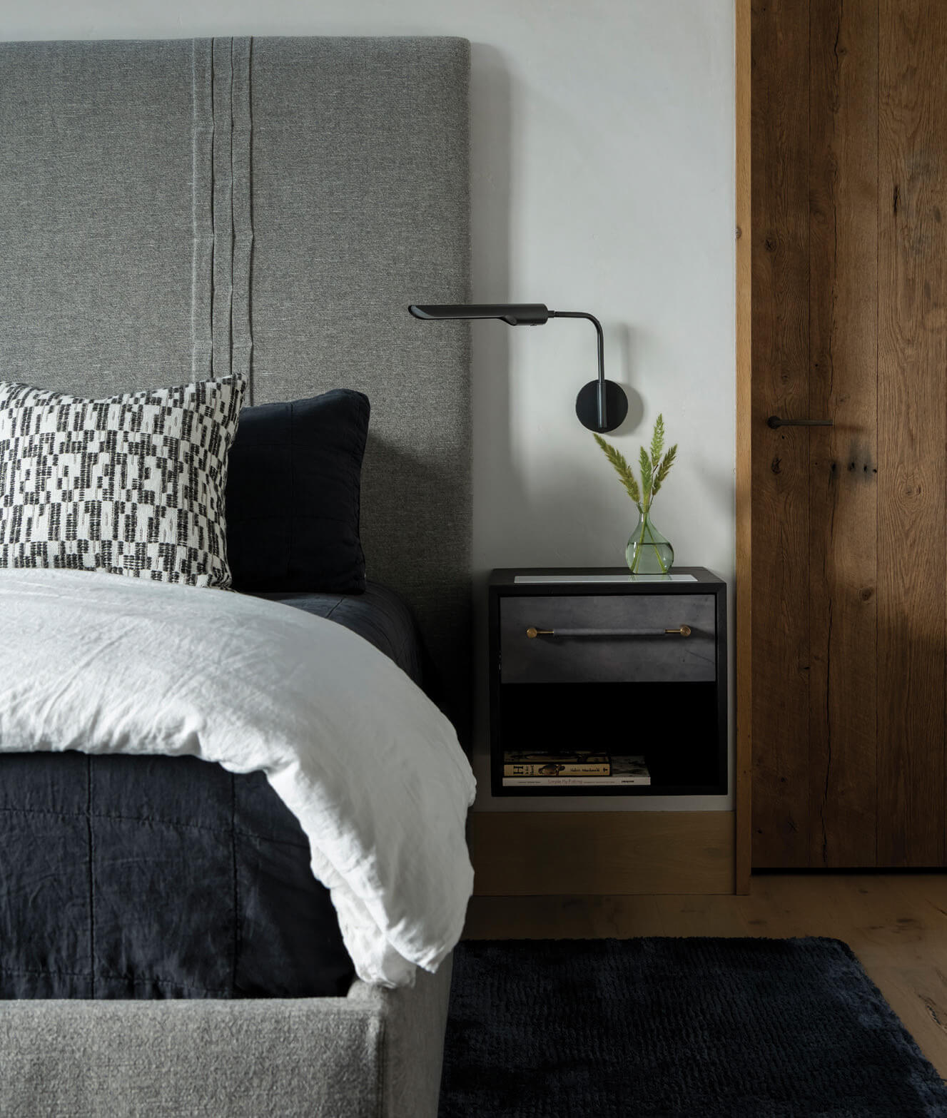 Luxurious finishes executed with subtlety and finesse abound. Here, a black-and-white palette defines a guest room. The bed is covered in gray wool while Wren & Cooper wall-mounted nightstands offer a practical place to stow nighttime essentials.