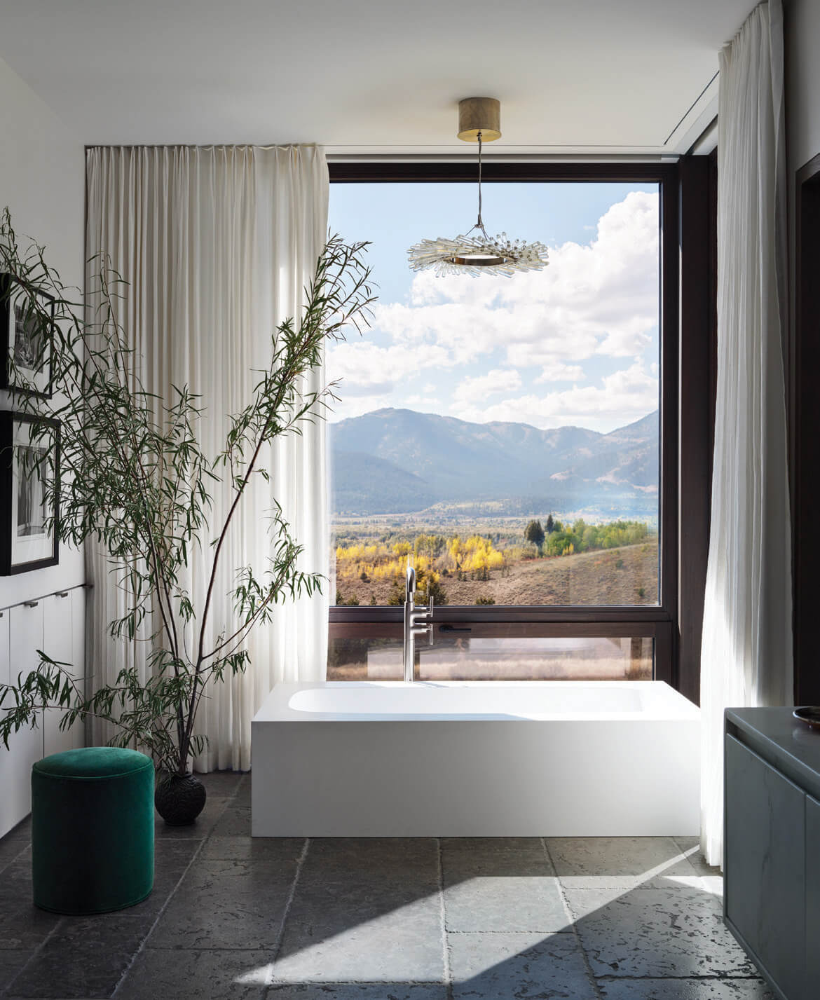 Carefully framed views — accented here by a Hersh Design pendant and Loro Piana linen drapes — are a feature throughout the house.