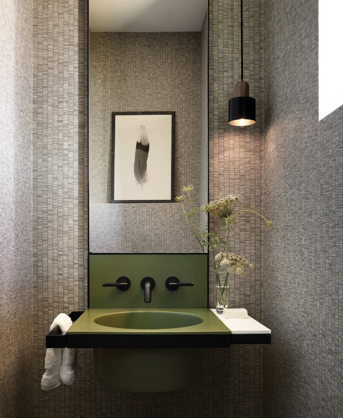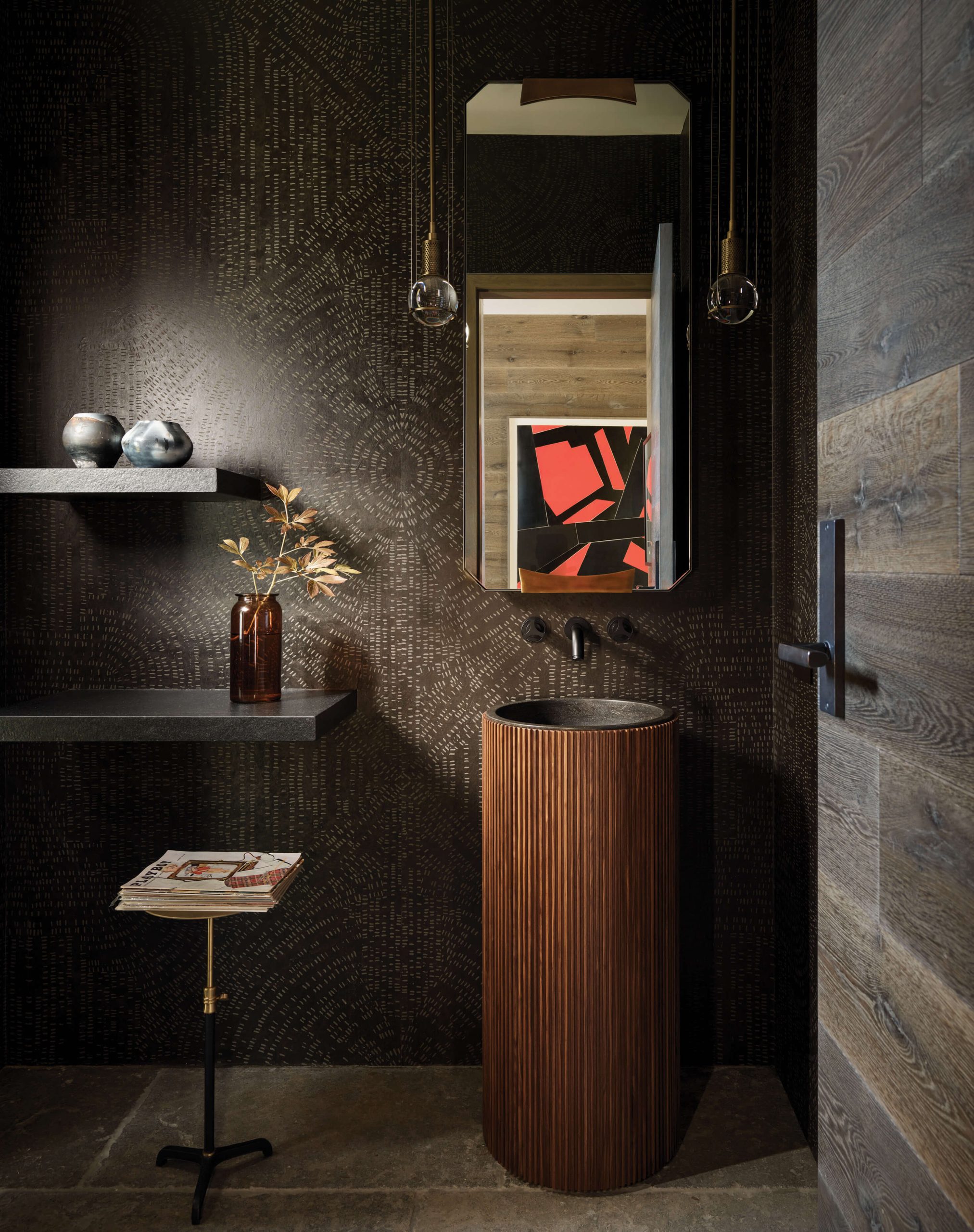 Gregorius Pineo wallpaper sets the tone in the moody powder room.