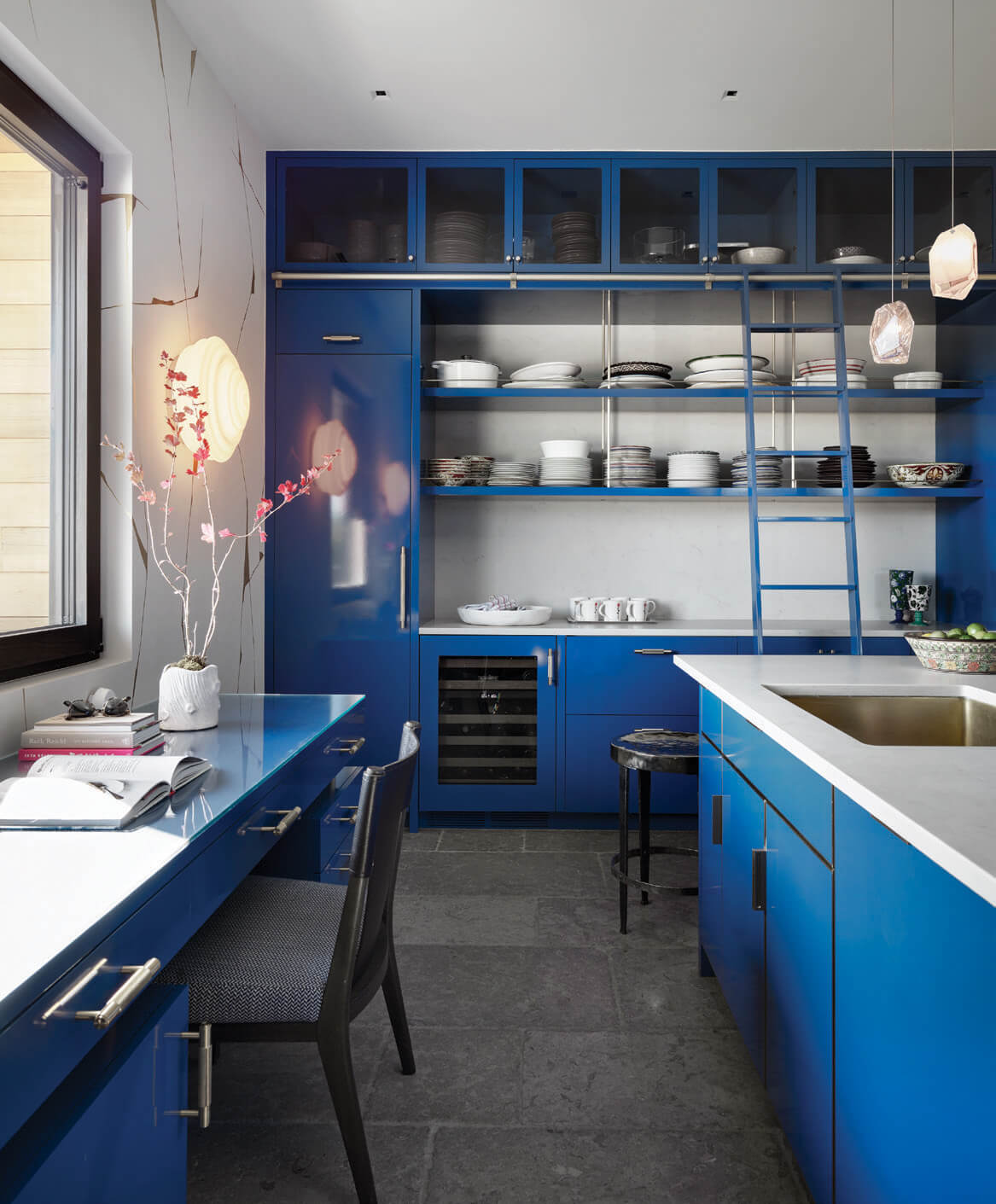 In the wife’s combination pantry/office, the blue of the lacquer cabinetry, accessorized with gold bronze hardware and details, was inspired by a Matisse painting, says Jenkins. “She said, ‘Reach outside your WRJ aesthetic. I want a lot of color.’”