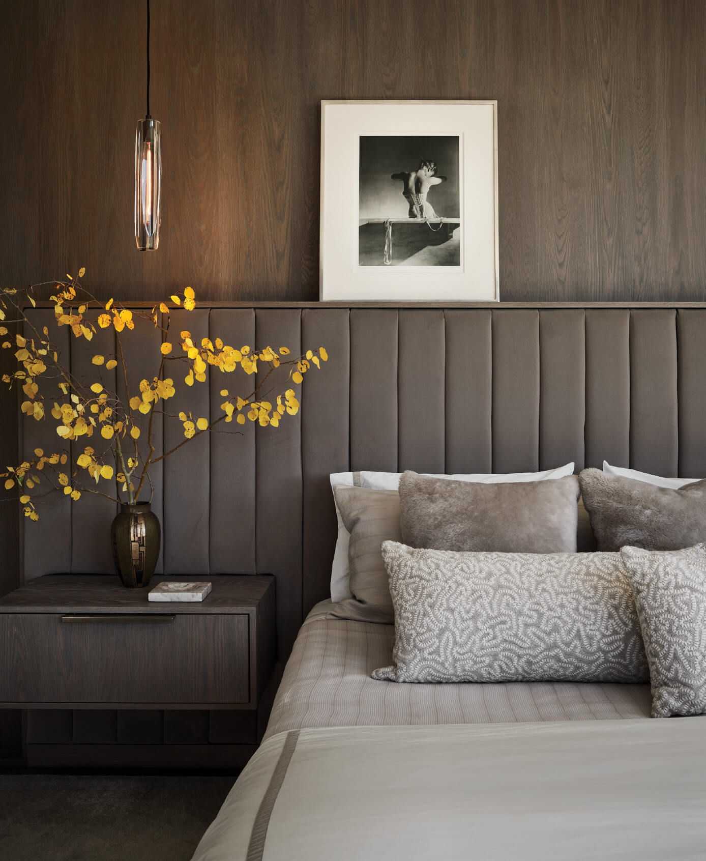 The primary bedroom presents a soothing neutral palette, with an integrated headboard designed by WRJ, a Carlyle Collective side table, and a Jonathan Browning pendant.