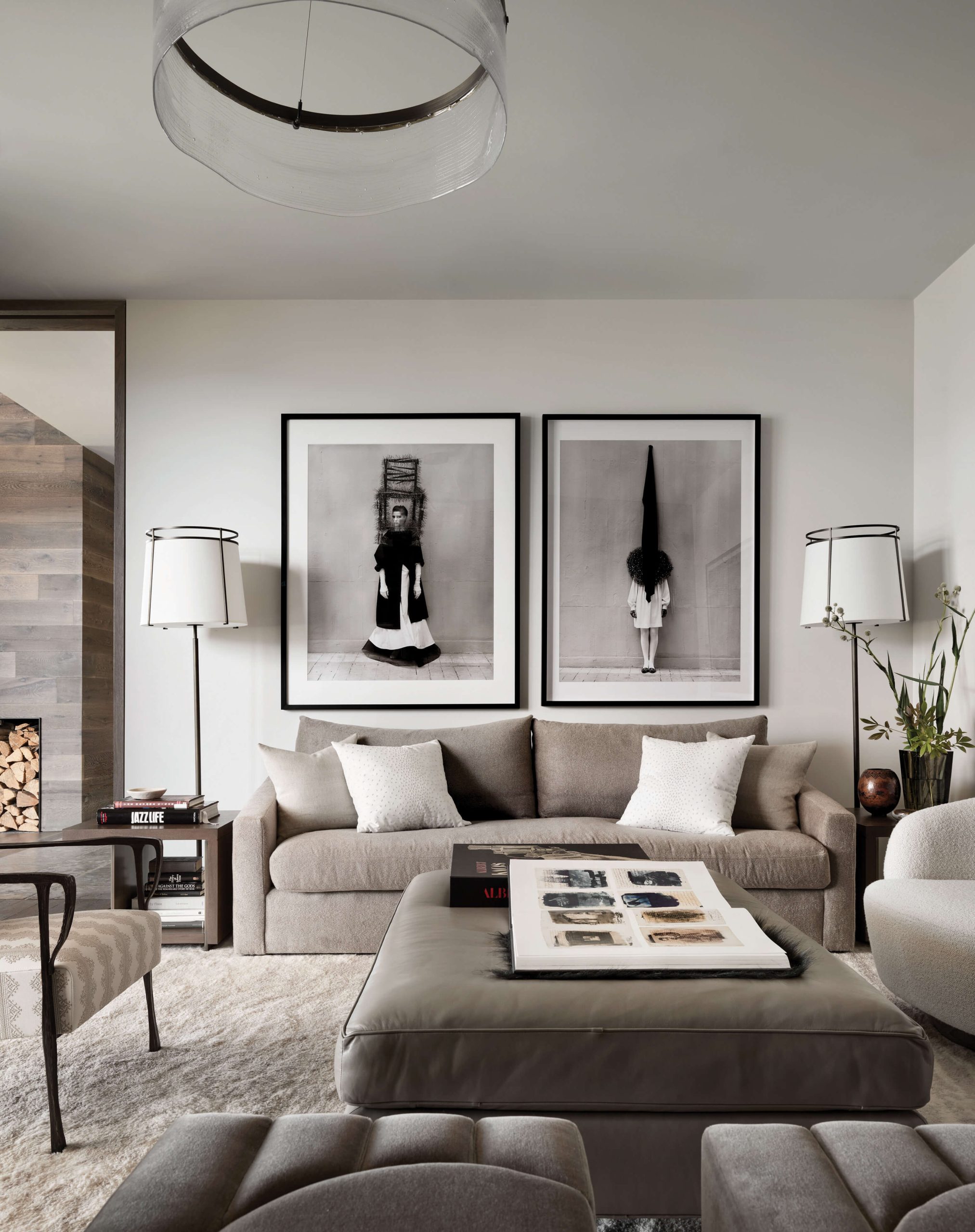 Soft, neutral furniture allows the striking black-and-white photos by Albert Watson to take center stage.
