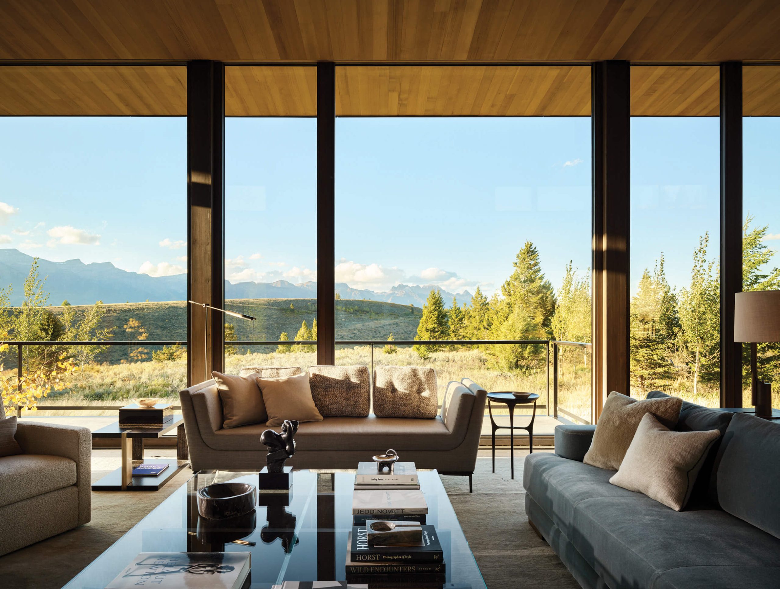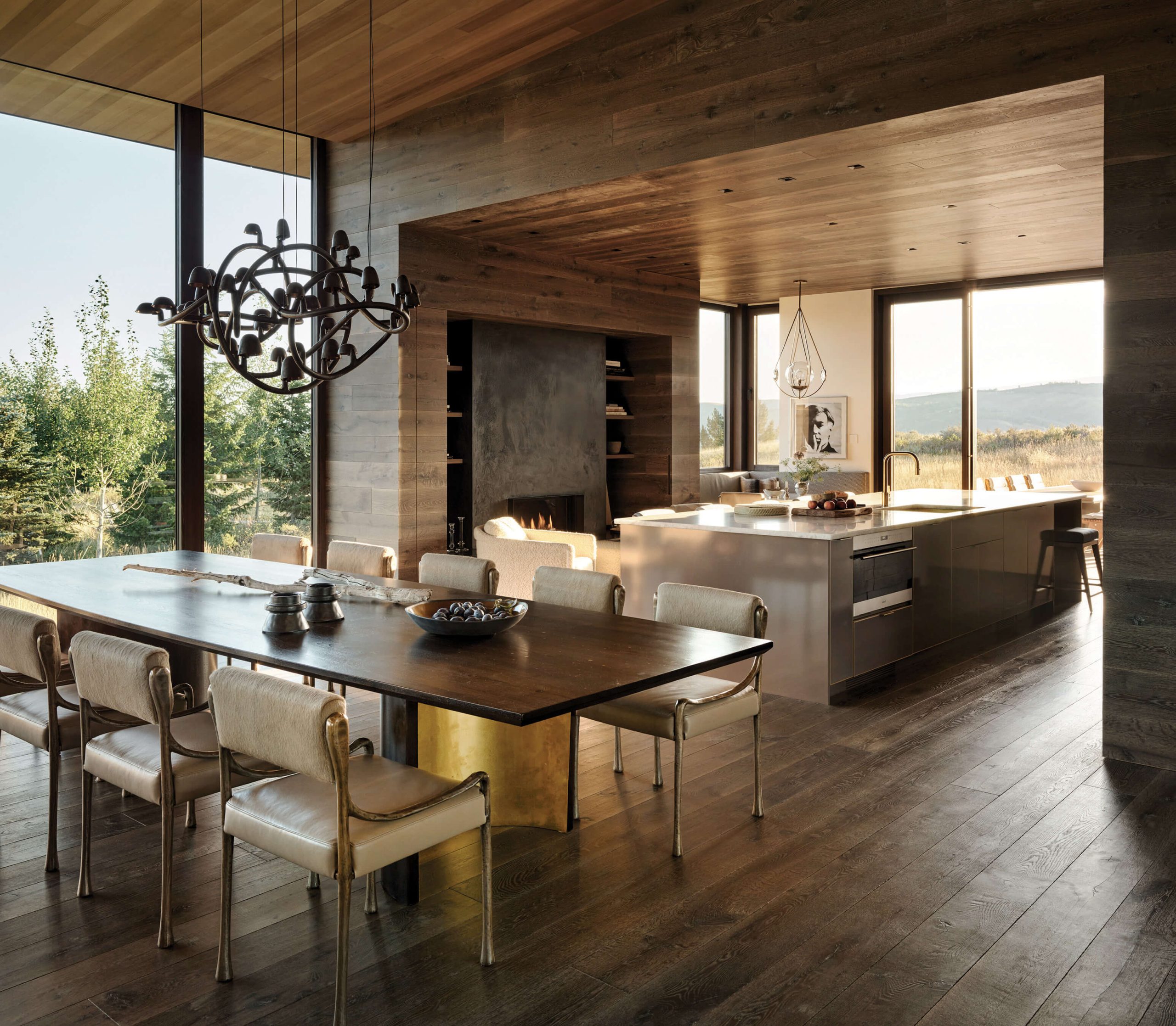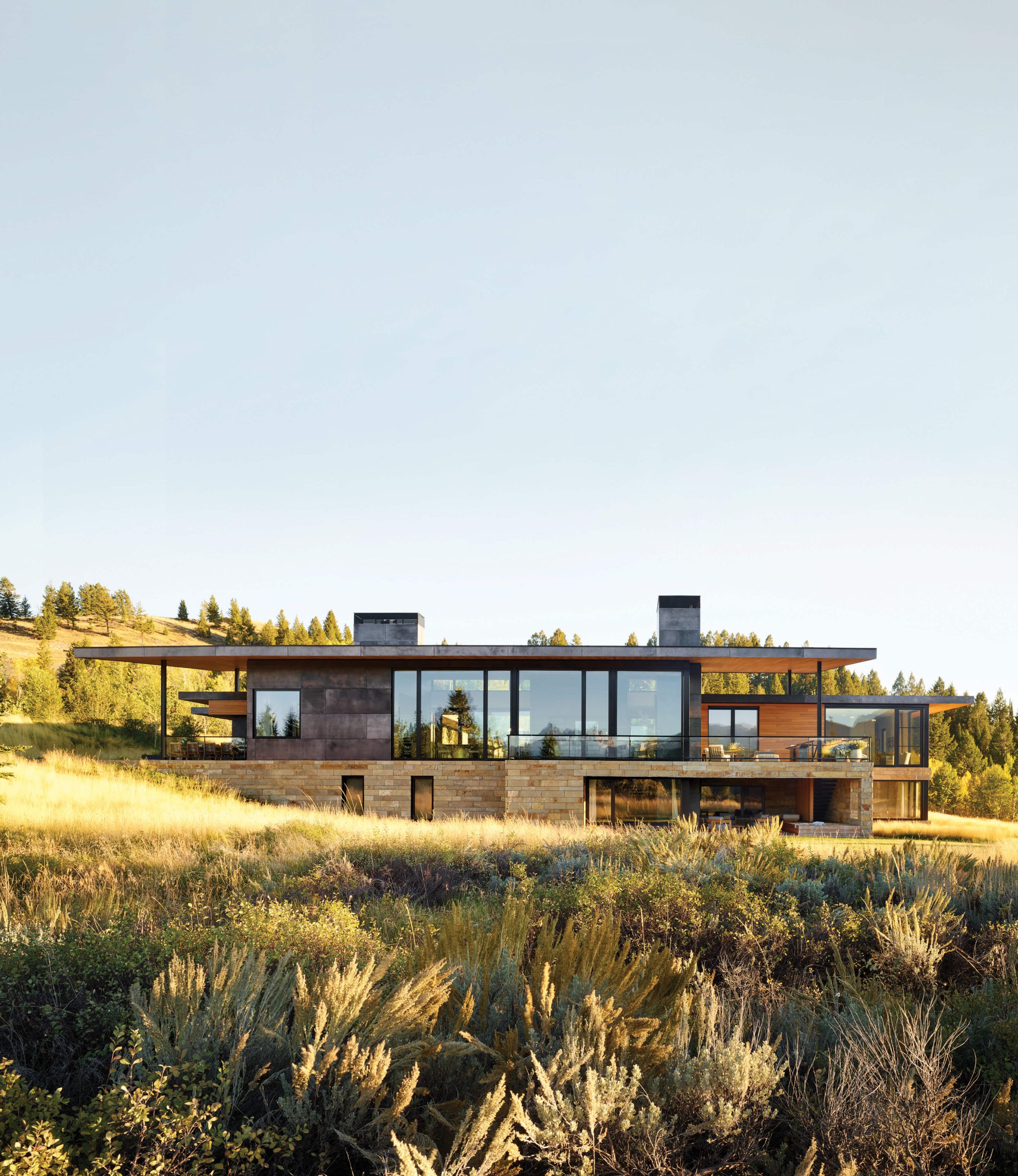 Cedar and blackened stainless steel volumes rise from a base of linear-cut sandstone, echoing the textures and tones of the surrounding landscape. “The house emerges from a rocky crest on this hill, so we wanted the base language to be very robust,” Ankeny says. “Frontier sandstone from Montana was sawn into coursing for a more modern interpretation of rustic stonework. It evokes that unfolding from the landscape, but also provides durability in wind and snow and rain.” The metal-clad chimneys act as vertical elements and visually anchor the home. Inside, warm western red cedar and hemlock complement floors of limestone and white oak. On the view side of the living area, floor-to-ceiling glazing runs the length of the space.