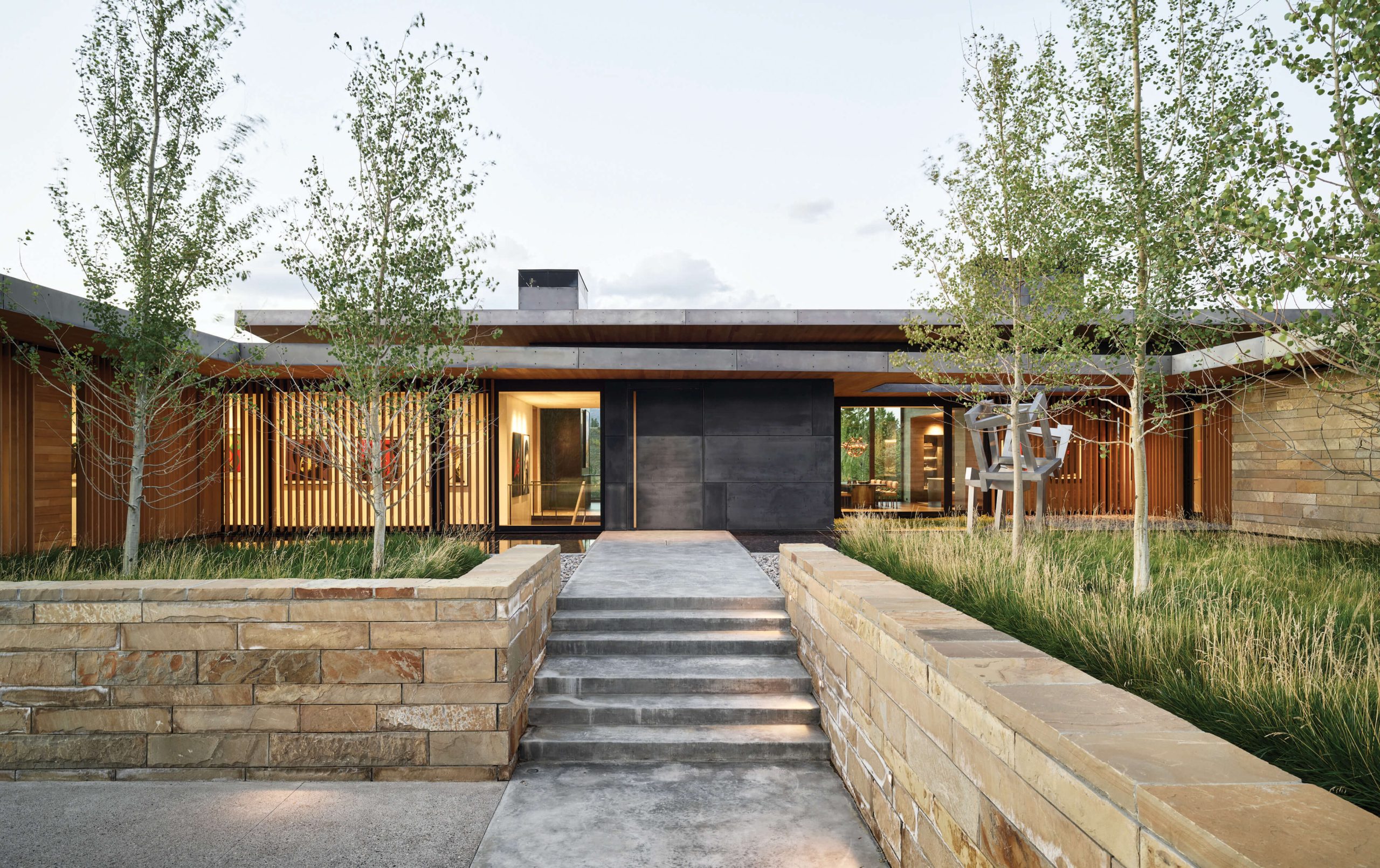 “This project is about contrast,” says Ankeny. “We’ve blended this robust Wyoming landscape with the clients’ spectacular art collection and high design goals, echoing both modern art and the Western landscape.” The result, he continues, “is a combination of introspective moments alongside beautiful, long-distance views that embrace the landscape. The experiences within this home are variable, yet the architecture itself is a simple, refined gesture.”