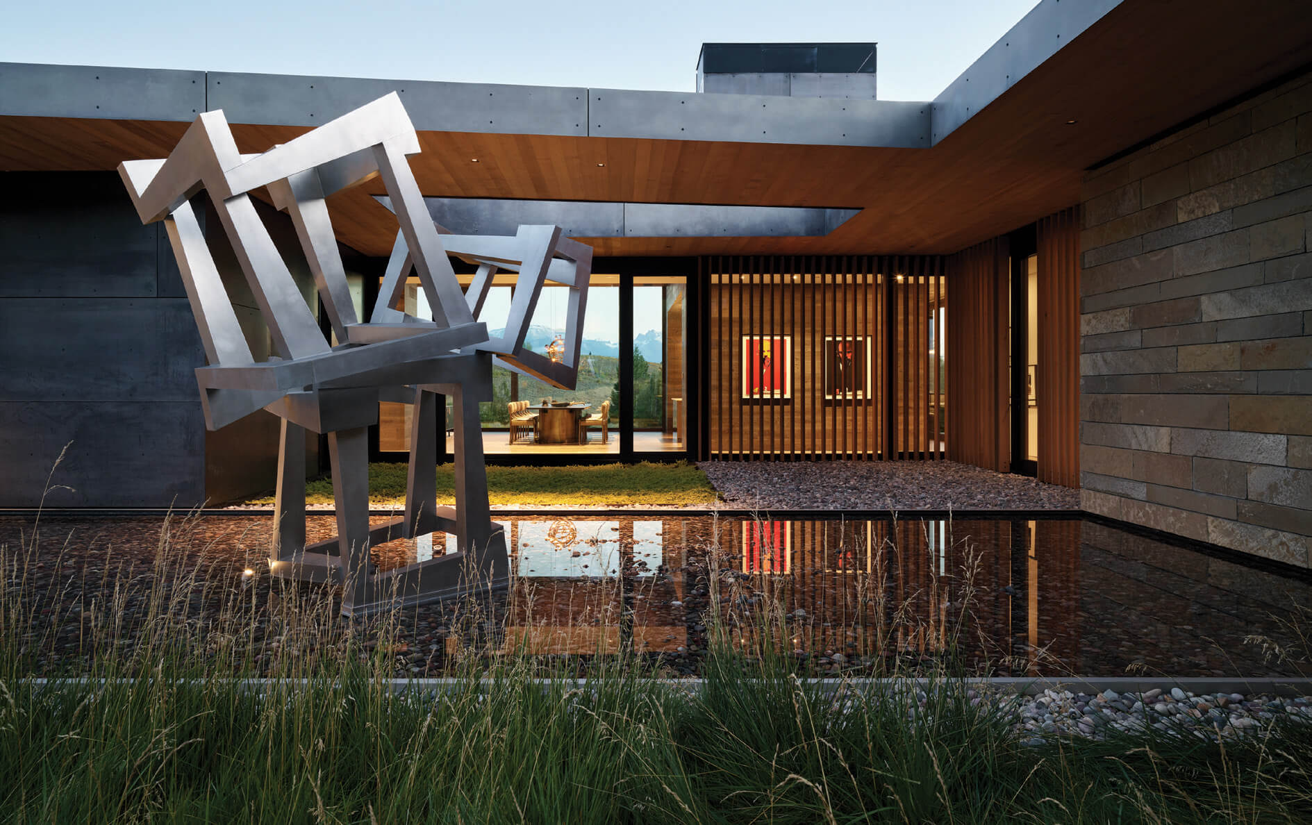 The architects’ plan would rest lightly on the ground from the approach; they would use the land’s natural contours to nestle into the windswept hillside site while opening up to views of the Teton and Gros Ventre mountain ranges to the north and east. Meanwhile, internationally recognized sculptor Jedd Novatt, a friend of the owners, was designing a site-specific work around which the house would be organized. The house, the sculpture, the art collection, and the land would each be given equal weight, each informed by the others, and each speaking to the next. The end result is an eloquent statement of harmony and appropriateness, a natural outcome of a holistic approach from a like-minded group of talented creative professionals rooted in the West.