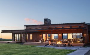 At the south-facing back of the house, a paved deck with a firepit — surrounded by Adirondack chairs in powder-coated steel and white oak by MFGR Designs — provides an ideal gathering spot, even on chilly Montana nights.