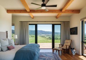 Comfort and serenity reign in the couple’s bedroom. Although not overly large, it offers enough space for a king-sized bed and a comfortable armchair and ottoman. The chamber’s most important features, however, are the window walls on three sides — north, south, and west — that make it feel like a private viewing station for the vistas in each direction, and a private deck that extends from its west-facing wall in the direction of downtown Bozeman. “During the fall,” says the wife, “if we’re sitting outside in the evening on our private deck, we can even hear the announcers from the stadium at Montana State University, and that’s maybe 5 miles away.”