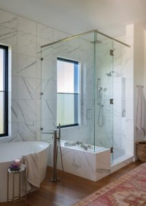 The marble-tiled primary bath fulfills her preferences, with a deep soaking tub from Kohler, and his, with an enclosure that includes three separate shower heads and a built-in bench.