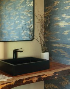 The man of the house finished the powder room’s live-edge redwood counter in his own woodshop adjoining the garage. The blue porcelain wall tiles with gold-leaf overlay are from Artistic Tiles.