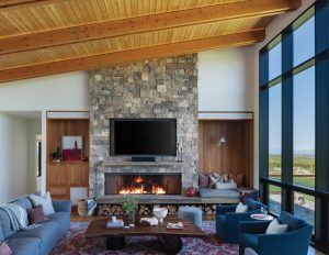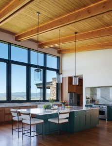 All of those goals — from the clients, architecture firm, interior designer, and contractor alike — come together harmoniously in the great room, which makes up approximately one-third of the total indoor space. It encompasses a living area with the largest fireplace Lusin, Skelton, and their team have ever designed; a spacious dining area; and a kitchen generously equipped for an extended family that loves to cook and eat together, all flanked by energy-efficient windows rising to the top of a ceiling 15 feet tall on the north-facing side and 11 feet on the south. Herbst, working closely with her clients, furnished the living space with oversized, comfortable, easy-care seating with low profiles for unobstructed views of the vistas on display.