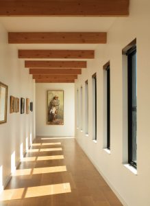 From the foyer, a hallway continues to a pair of guest bedrooms with en-suite baths. The long wall displays both selections from a fine art collection and framed childhood art by the owners’ now-grown daughters. At the end hangs a portrait of Geronimo by Allen Polt.