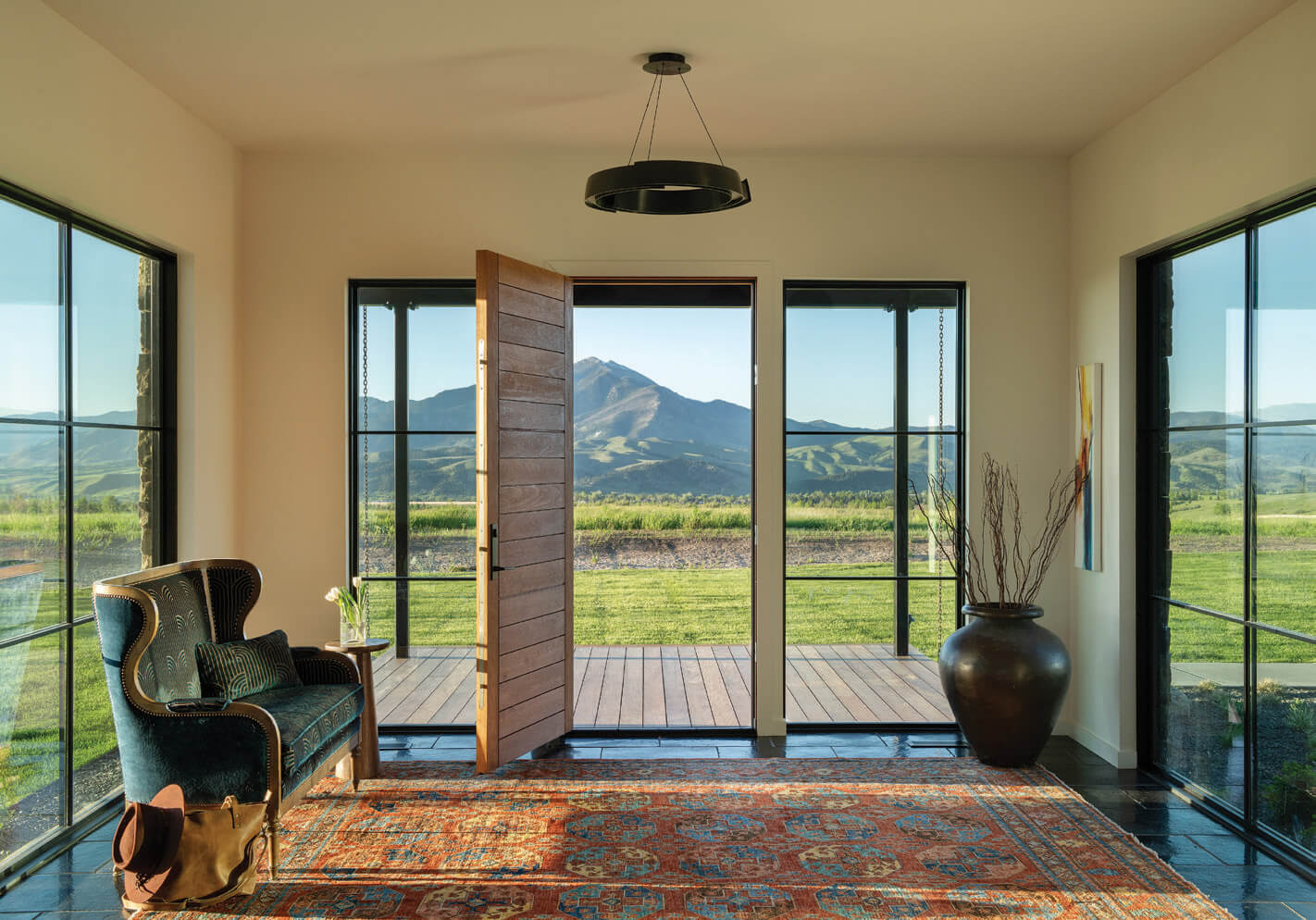A spacious, cube-shaped foyer opens to a view of the Bridgers and Baldy Mountain. Interior designer Jessica Herbst reupholstered the owners’ settee in Art Deco-style fabrics from Mesia Paris. The area rug is from Botanica Fine Art Gallery in Bozeman, Montana.