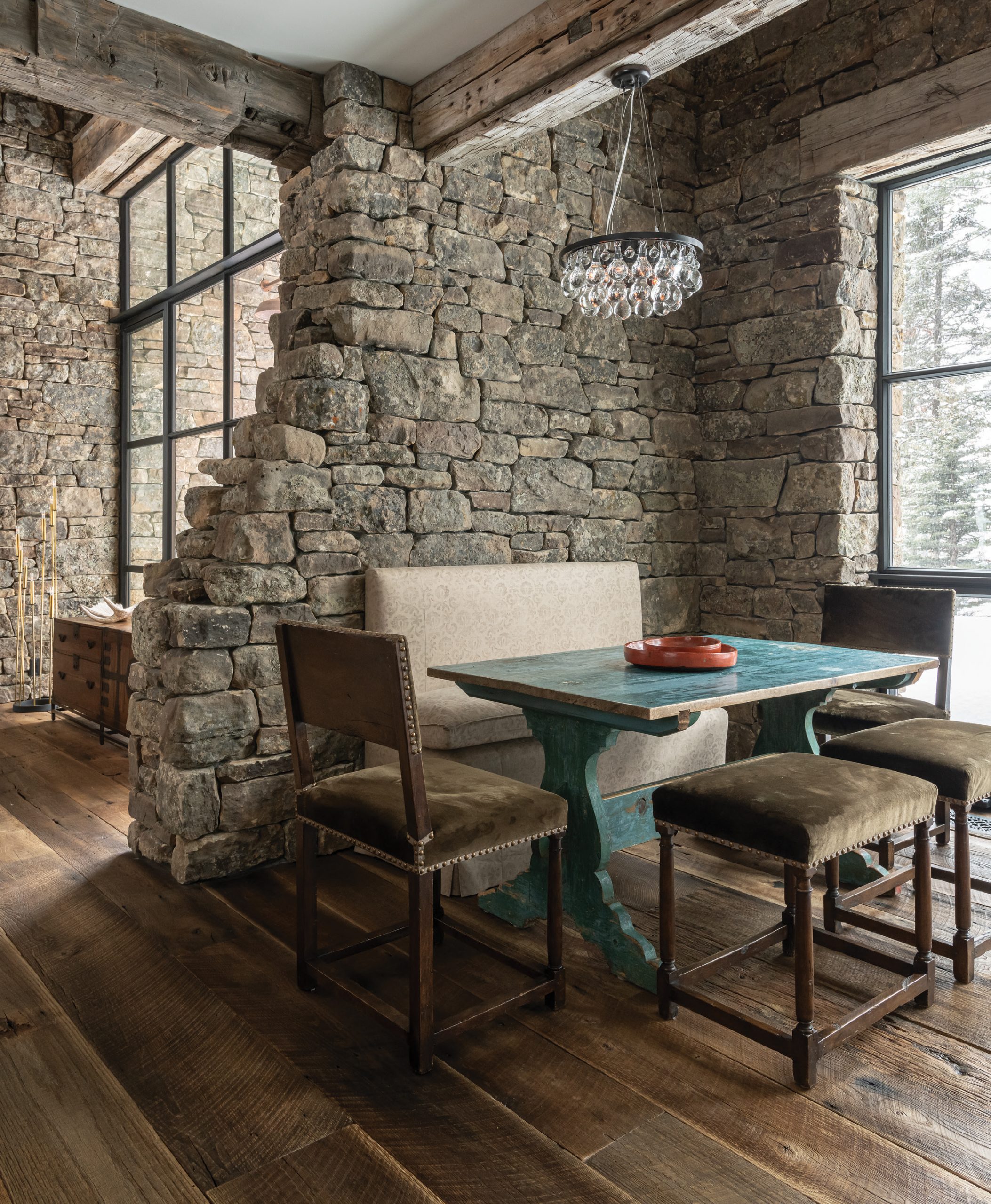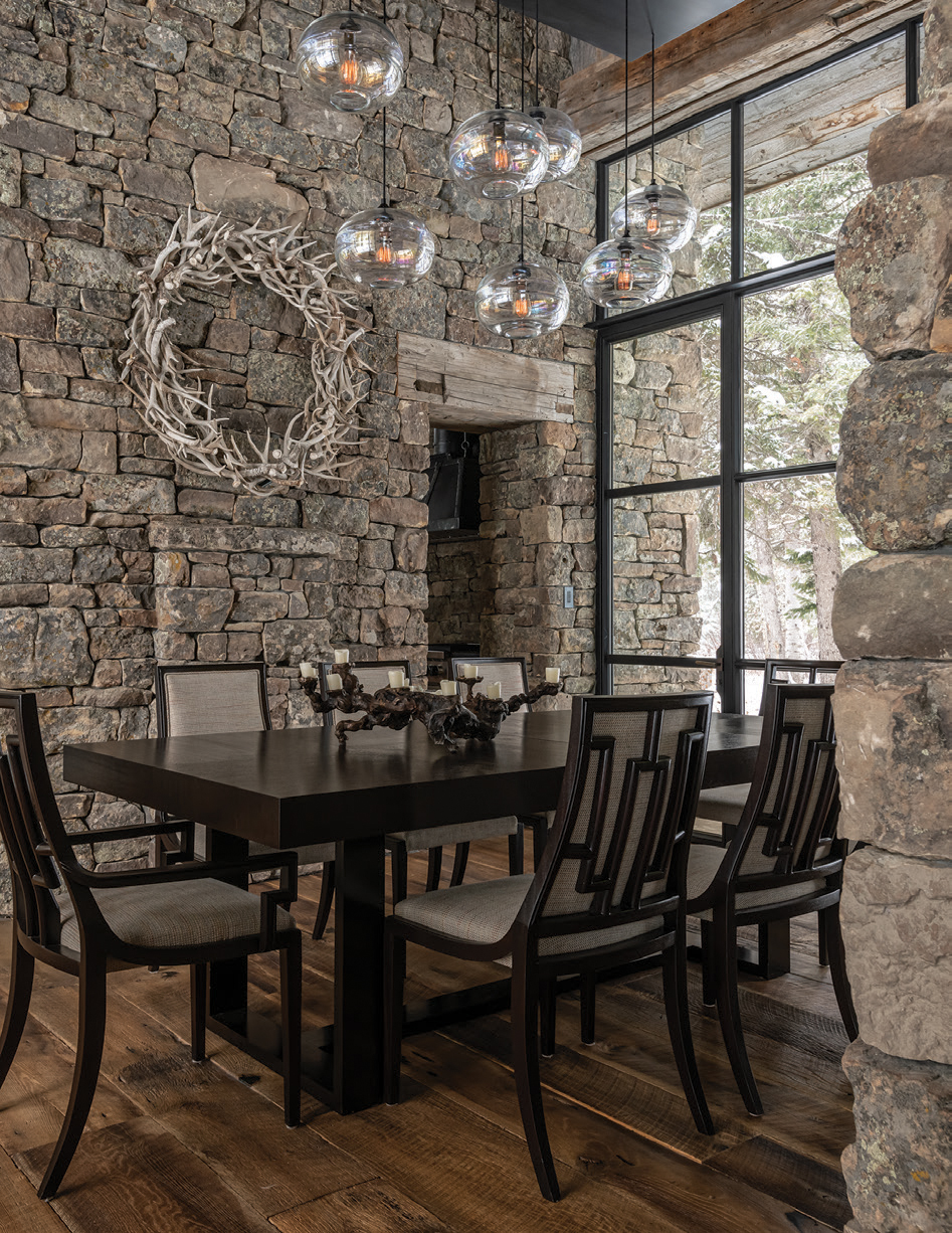 - An antler wreath from Game Trail Gatherings, made by local artist Kyle Anderson, hangs on the stone walls of the dining room. The lighting is by John Pomp Studios, and the table and chairs are from Michael Berman Limited.