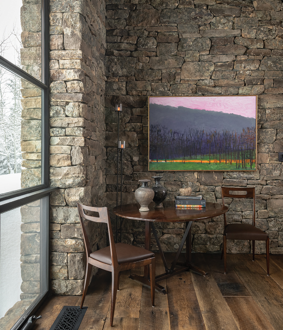 The main part of the home consists of two stone volumes, conceived as remnant structures, connected by a glass-walled dining room. An offset gabled entry leads into a space defined by a rugged open stairwell that was constructed around a signature artwork: a Jane Rosen sculpture that sits on a pedestal with a bench-like perch, where those entering the home can sit to remove snowy boots. To its left, a two-story volume, paneled in reclaimed pine, houses the upstairs bedrooms. On its far side, a one-story stone structure, containing a mudroom and laundry area off the garage, is topped with a rusted standing-seam metal roof.